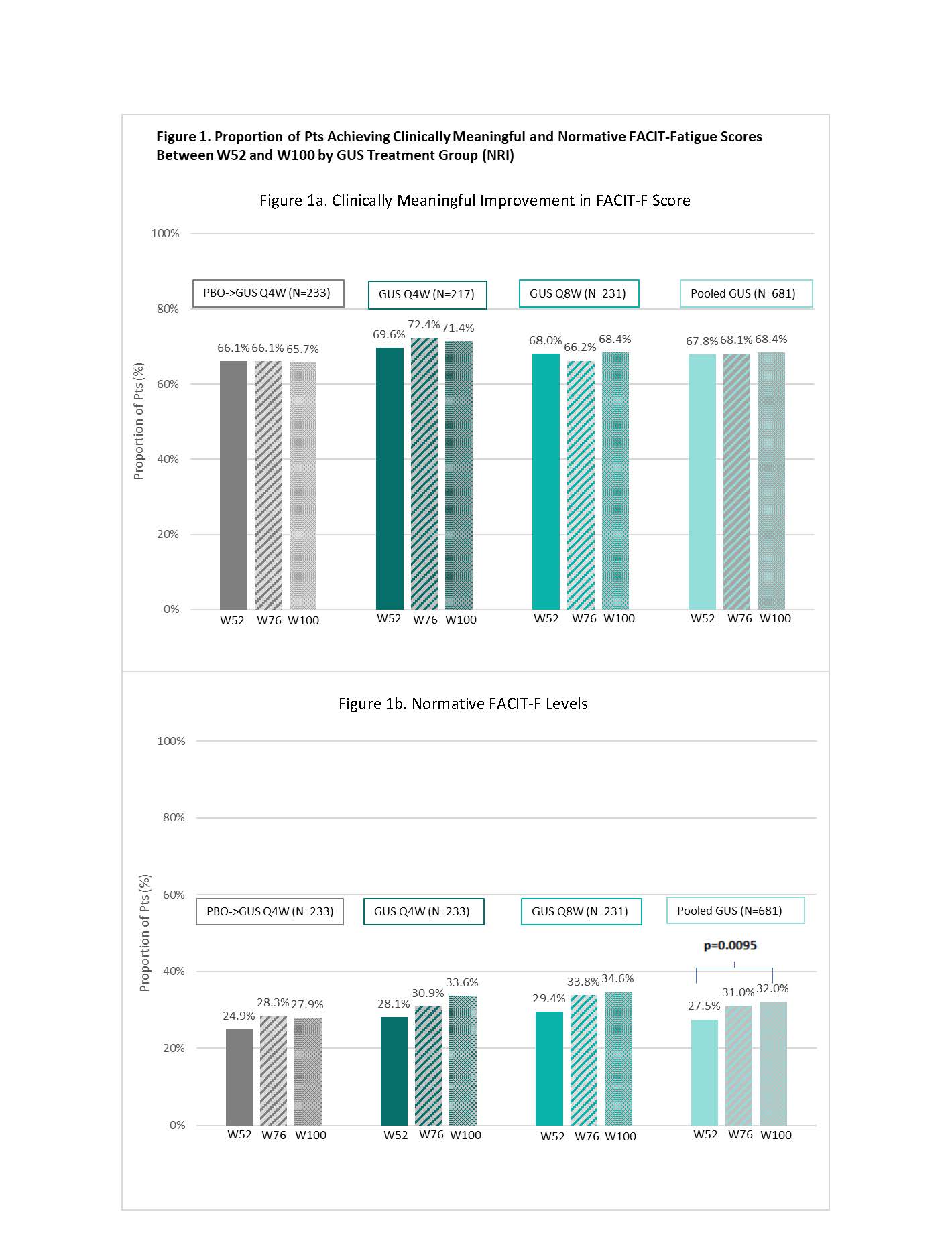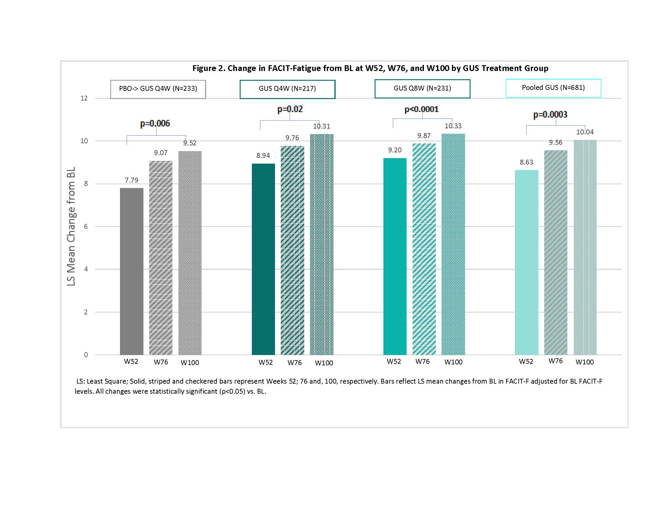 Conclusion: The clinically meaningful improvements in fatigue seen after 1 year of GUS treatment were further enhanced through 2 years, at which time nearly a third of GUS-treated pts reported normative FACIT-F levels. Early targets in FACIT-F levels achieved with GUS were identified to aid in guiding treatment decisions in routine clinical practice.