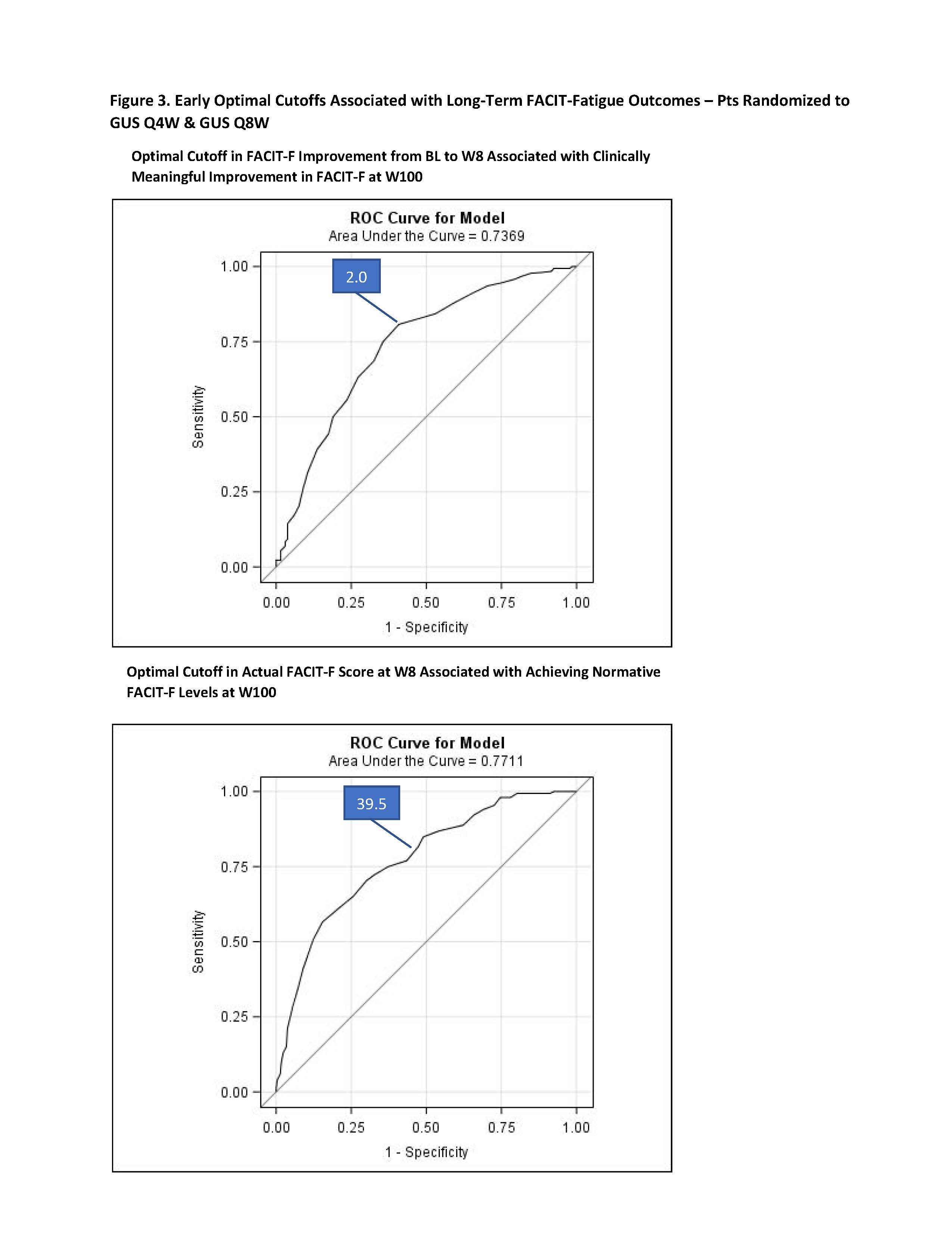 Results: At BL, the mean (SD) FACIT-F score was 28.3 (8.7) with similar levels across treatment groups. At W52, 66.1%, 69.6%, 68.0%, and 67.8% of pts in the PBO→GUS Q4W, GUS Q4W, GUS Q8W, and pooled GUS groups, respectively, achieved clinically meaningful improvements from BL in FACIT-F score; response rates were maintained through W100 (Figure 1a). Normative FACIT-F levels were achieved by 24.9%, 28.1% 29.4% and 27.5% of pts in each treatment group, respectively, at W52, and by increasingly greater proportions of pts through W100 (Figure 2b). Significant improvements from BL in FACIT-F scores were observed at W52 (all nominal p< 0.05), with further improvements seen from W52 to W100 across all GUS groups (Figure 2). ROC optimal cutoff in FACIT-F improvement from BL to W8 associated with a clinically meaningful improvement in FACIT-F at W100 was ≥2.0 (nominal p< 0.0001); while for achieving normative FACIT-F levels at W100, the optimal cutoff in actual FACIT-F score at W8 was ≥39.5 (nominal p< 0.0001) (Figure 3).