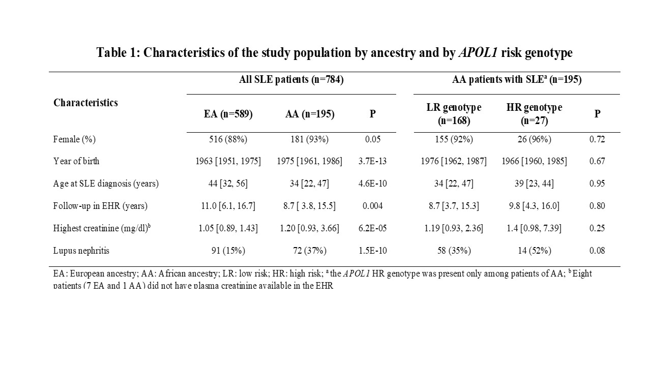 Table 1: Characteristics of the study population by ancestry and by APOL1 risk genotype