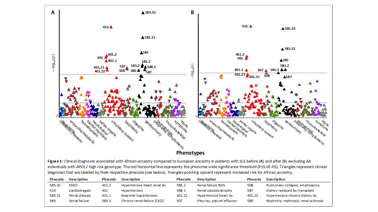 Figure 1: Clinical diagnoses associated with African ancestry compared to European ancestry in patients with SLE before (A) and after (B) excluding AA individuals with APOL1 high risk genotype. The red horizontal line represents the phenome-wide significance threshold (P≤5.0E-05). Triangles represent clinical diagnoses that are labeled by their respective phecode (see below). Triangles pointing upward represent increased risk for African ancestry