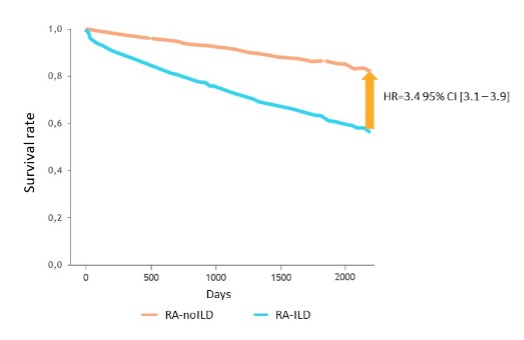 Results: Among the 173,132 patients with RA, ILD was identified in 4330 (2.5%). In patients with RA-ILD, mean age at RA onset was 63.3 ± 13.7 years and 39.8% were male. ILD onset occurred after RA onset in 71.6% of patients, concomitant with RA onset (± 1 year of RA onset) in 25.8%, and before RA onset in 2.5%. After matching, RA-ILD was associated with an increased mortality rate (hazard ratio [HR], 3.4; 95% confidence interval [CI], 3.1–3.9; Figure 1). Sensitivity analyses according to cardiovascular comorbidities and risk factors showed similar findings. The increased mortality rate was higher in patients aged < 75 years (HR, 4.8; 95% CI, 3.9–5.9) compared with patients aged > 75 years (HR, 3.0; 95% CI, 2.6–3.5); patients with ILD onset occurring before RA onset (HR, 8.4; 95% CI, 5.5–13.0) compared with patients with concomitant onset (HR, 5.3; 95% CI, 4.6–6.2) and with patients with ILD onset after RA onset (HR, 2.9; 95% CI, 2.6–3.3); and male patients (HR, 5.2; 95% CI, 4.4–6.2) compared with female patients (HR, 3.6; 95% CI, 3.0–4.2). The number of patients with ≥ 1 hospitalization was 1.45 times greater for patients with RA-ILD compared with RA-noILD.