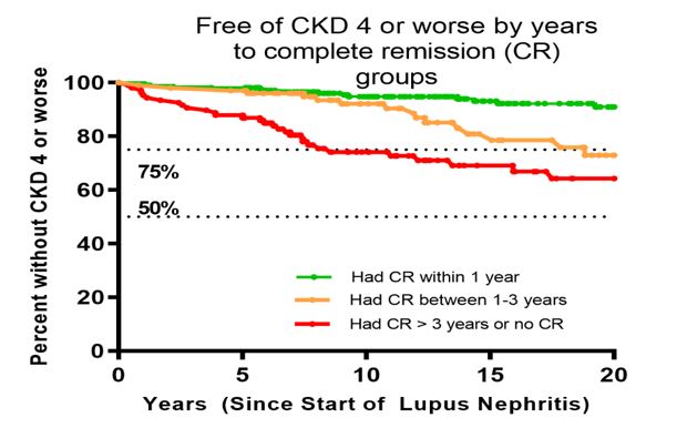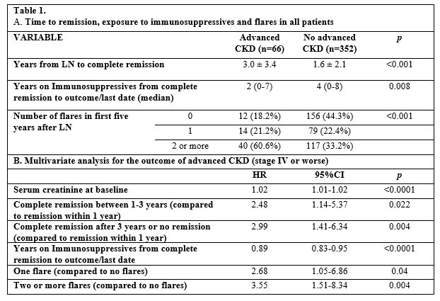 Conclusion: Complete remission within the 1st year from LN diagnosis strongly protects against advanced CKD. Flares significantly affect prognosis. One flare was associated with 2.7-fold increased risk for advanced CKD (3.6-fold for 2 or more flares). Longer time on immunosuppressives after remission is associated with decreased risk for advanced CKD. Our findings emphasize the importance of early remission as well as flare prevention with prolonged immunosuppressive use to maximize renal survival in LN.
