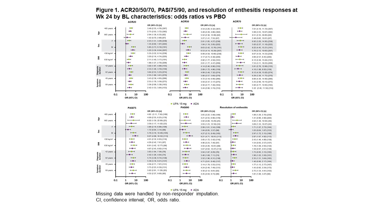 Methods: Pts in SELECT-PsA 1 were randomized 1:1:1:1 to UPA 15/30 mg once daily, ADA 40 mg every other wk, or placebo (PBO) followed by UPA 15/30 mg starting at Wk 24; treatment was double blinded until Wk 56.2 This subgroup analysis evaluated the efficacy of UPA 15 mg vs ADA based on pts' ages (< 65 vs ≥65 years), sex (male [M] vs female [F]), BMI (< 30 vs ≥30 kg/m2), time since diagnosis (< 2 vs ≥2 years), and symptom duration (< 9 vs ≥9 years) at baseline (BL). Outcomes assessed included ≥20%/50%/70% improvement in ACR criteria (ACR20/50/70), ≥75%/90% improvement in Psoriasis Area and Severity Index (PASI75/90), and resolution of enthesitis, all at Wks 24 and 56; and change from BL in tender/swollen joint count in 68/66 joints (TJC68/SJC66), Physicians' and Pts' Global Assessment of disease activity (PhGA and PtGA), pts' assessment of pain, high-sensitivity CRP (hsCRP), and Health Assessment Questionnaire Disability Index (HAQ-DI) through Wk 56.