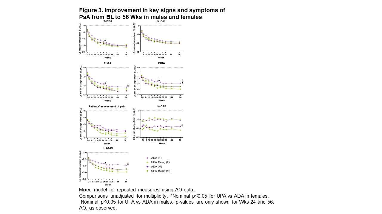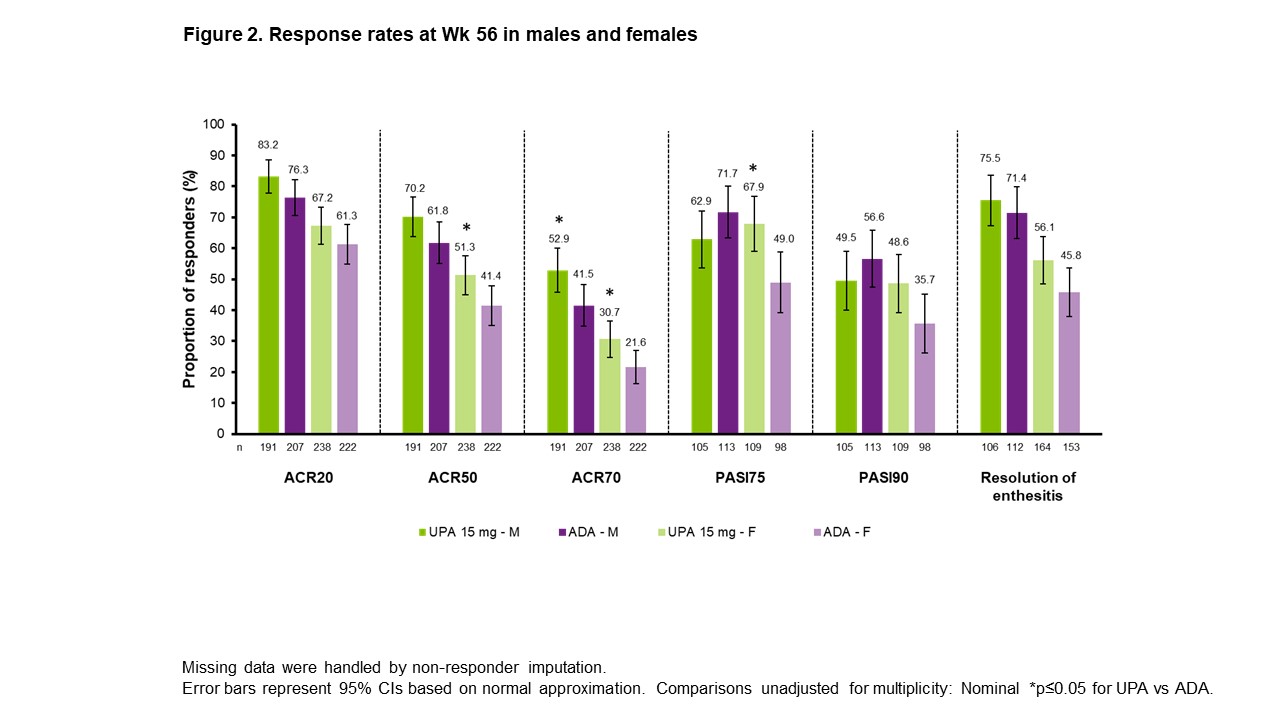 Conclusion: We observed sex-based differences in response to UPA vs ADA in pts with PsA. Significantly greater improvements in ACR70, PtGA, pts' assessment of pain, and hsCRP in M, and in ACR50/70, PASI75, PhGA, PtGA, and HAQ-DI in F, were seen with UPA vs ADA at Wk 56.