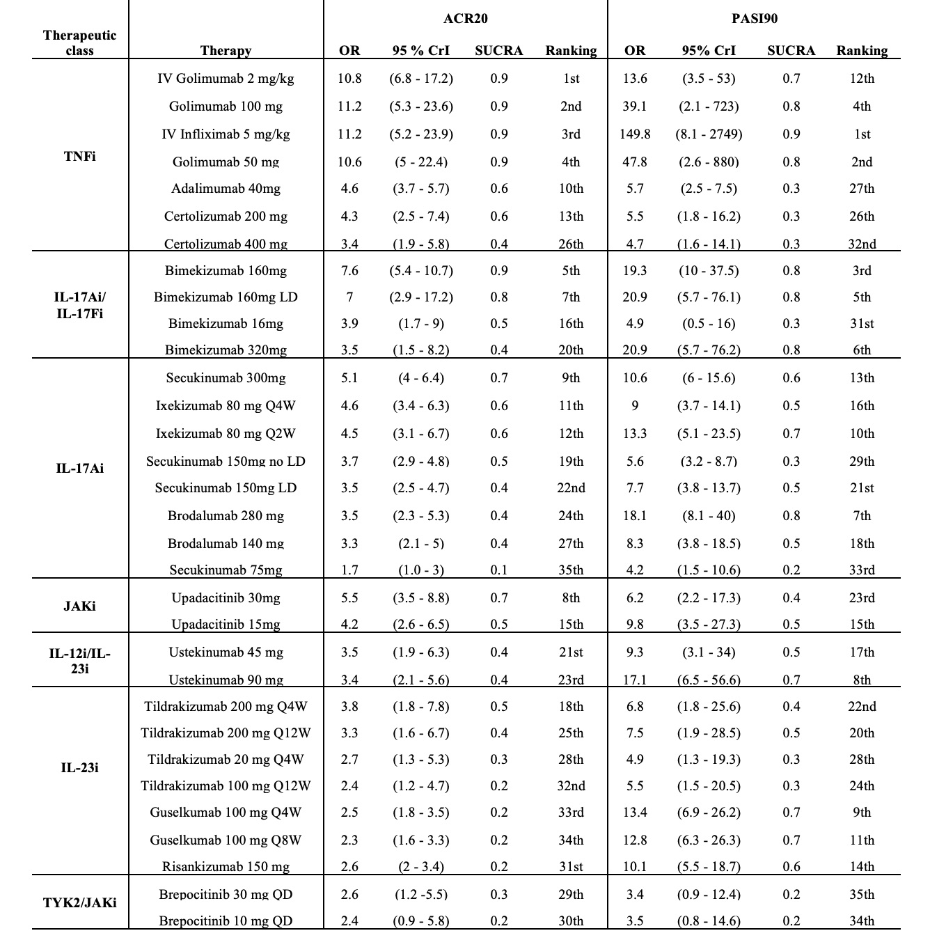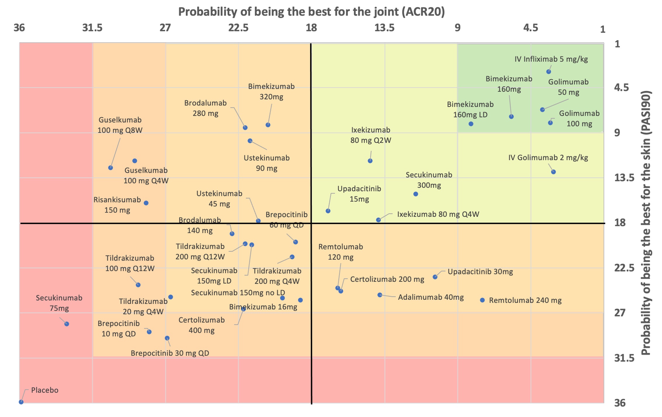 Figure 1. Hierarchy of bDMARDs and tsDMARDS by mean rank of ACR20 and PASI90. Best possible outcome achieved by therapies on the right top corner and worst outcome achieved by therapies on lower left corner.