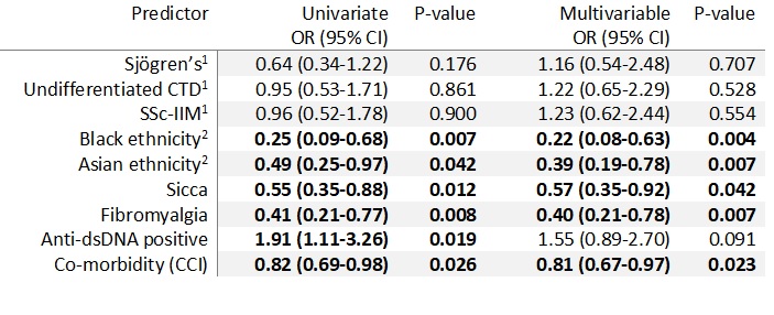 Table 1 - Univariate and multivariable ordinal logistic regression to compare patient characteristics across LPs with LP1 (poor QoL) used as the reference category. Reference group: 1, SLE; 2, White. Multivariate analysis adjusted for ethnicity, sicca, fibromyalgia, anti-dsDNA antibodies and Charlson co-morbidity index. CTD, connective tissue disease; CCI, Charlson comorbidity index; dsDNA, double stranded DNA; OR, odds ratio; SSc-IIM, systemic sclerosis- idiopathic inflammatory myopathy syndrome.