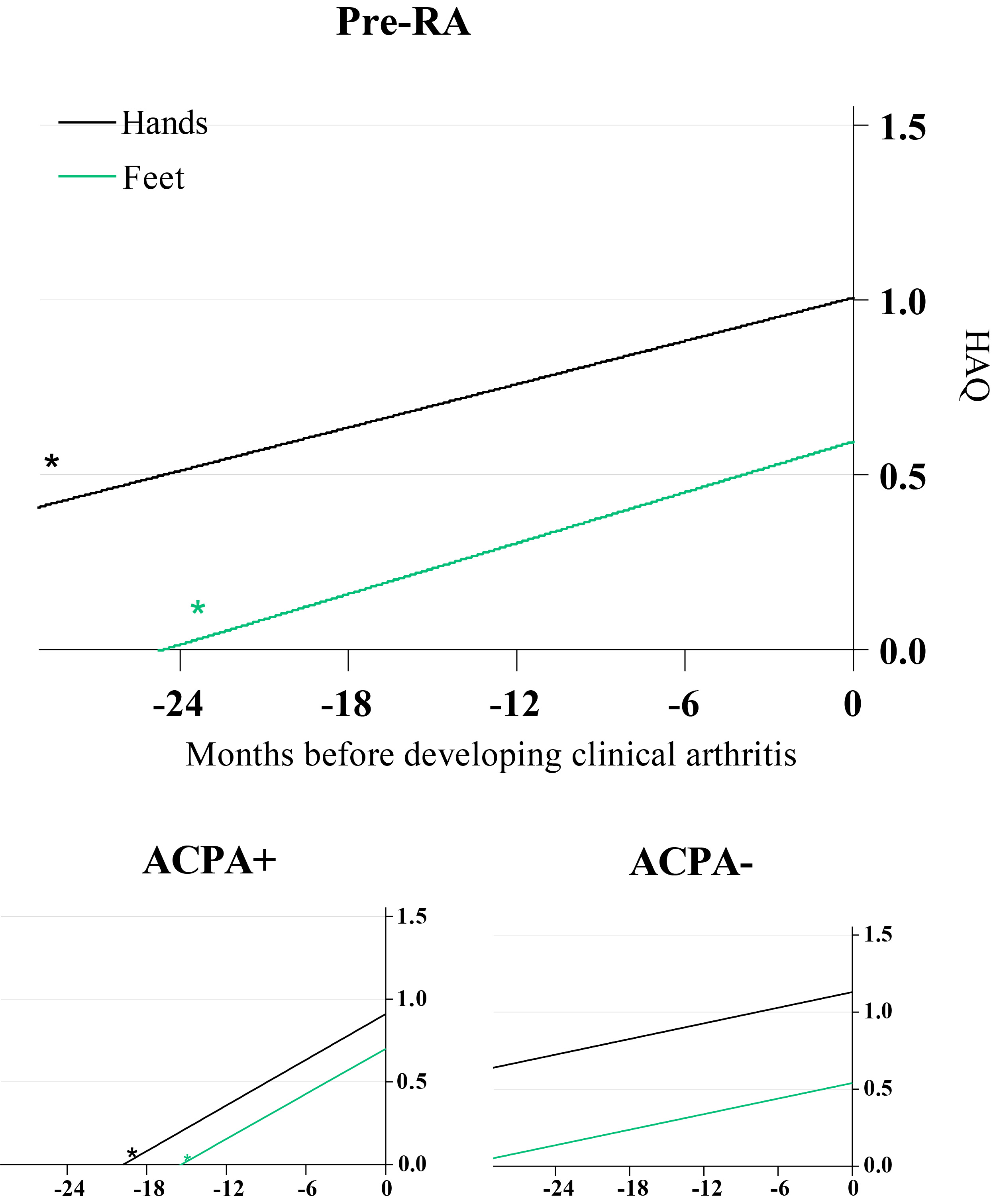 Legend: lines depict the average course of functional disabilities in the hands (dressing, eating, grip) and feet (walking) prior to clinical arthritis, derived from linear mixed model analyses. In these analyses, moment of clinical arthritis is defined as t=0 and functional disabilities prior to clinical arthritis was analyzed. *statistically significant increases in HAQ-scores. Abbreviations: ACPA=anti-citrullinated protein antibody; HAQ=Health Assessment Questionnaire Disability-Index; RA=rheumatoid arthritis.