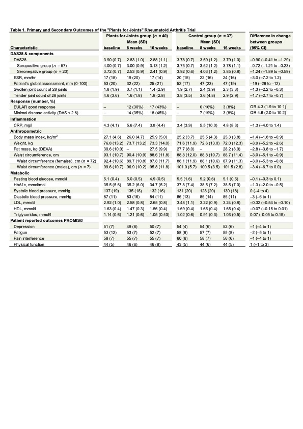 All values for the total group (n = 77), except the DAS28 for the seropositive and seronegative group. Seropositive subjects are positive for rheumatoid factor [RF] or anti-citrullinated protein antibodies [ACPA], seronegative subjects are negative for RF and ACPA. DAS28 = 28-joint disease activity score, ESR = erythrocyte sedimentation rate, patient's self reported global assessment of disease activity is based on a visual analogue scale (0-100 mm) with higher values indicating more disease activity, EULAR Good Response = improvement DAS28 > 1.2 and DAS28 ≤ 3.2 (non-responders include responders EULAR Moderate Response), CRP = C-reactive protein, DEXA = Dual-energy X-ray absorptiometry, SD = standard deviation, CI = confidence interval, OR = odds ratio.