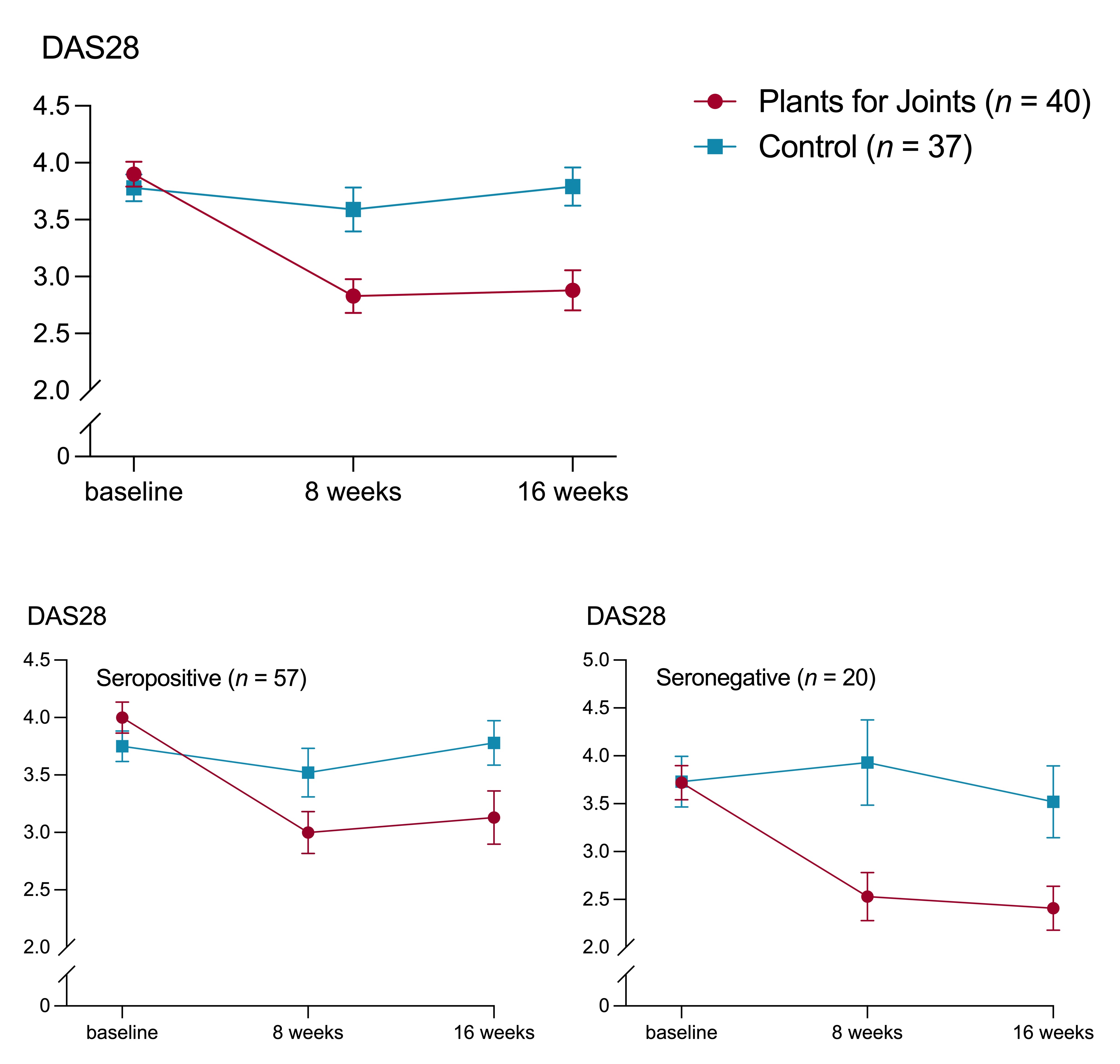 Change in disease activity score based on 28 joints (DAS28, primary outcome) for the total group (p < 0.0001) is presented in the top panel with mean ± standard error. The panels below present the same for seropositive subjects (positive for rheumatoid factor [RF] and/or anti-citrullinated protein antibodies [ACPA], p < 0.01) and seronegative subjects (negative for RF and ACPA, p < 0.01).