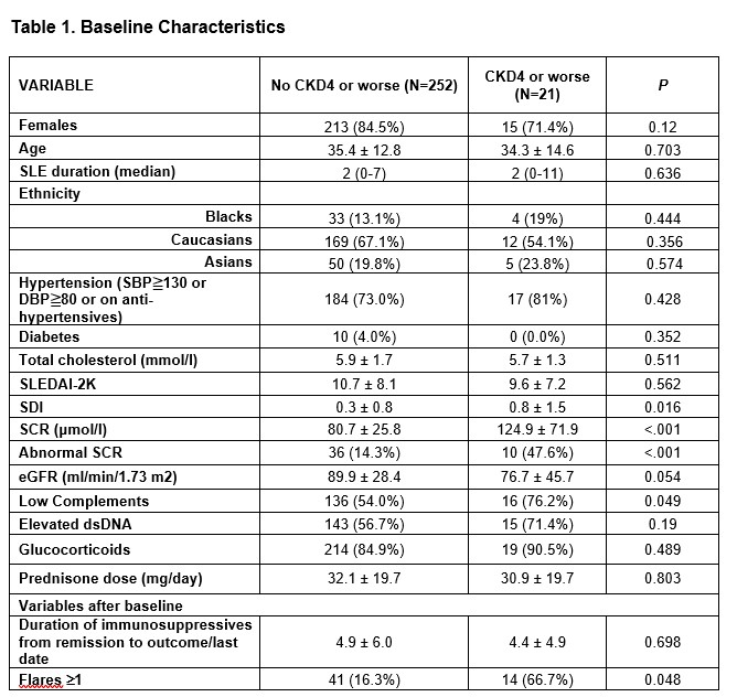 Methods: Patients with LN based on biopsy or abnormal proteinuria ( >0.5g/day) and/or hematuria or pyuria or casts for two consecutive visits in the absence of any other plausible explanation were retrieved from the Toronto Lupus Clinic longitudinal database. Individuals with advanced CKD at baseline (eGFR≦29ml/min/1.73m2) were excluded. All patients achieved complete remission (proteinuria< 0.5g/24h, inactive urinary sediment and serum creatinine £120% of baseline) within 12 months. Flare was defined as any abnormal proteinuria ( >0.5g/day) or increase in serum creatinine (SCR) from normal to abnormal or >120% of baseline after remission plus treatment escalation (glucocorticoids and/or immunosuppressives).