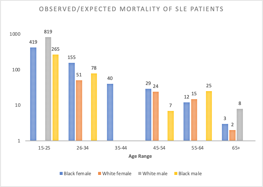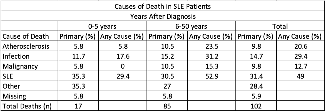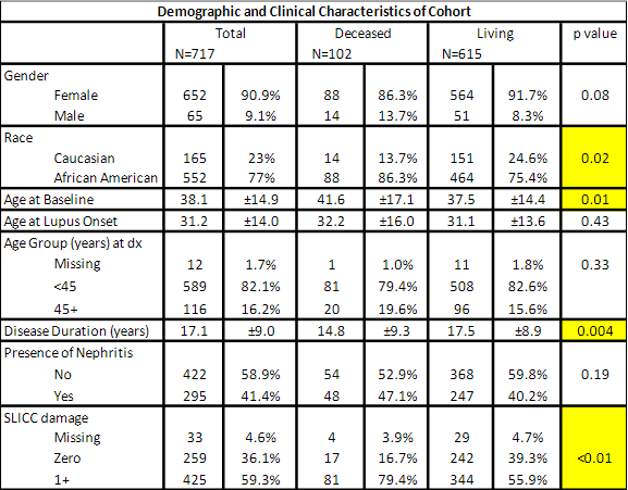 Cohort Demographics comparing total, deceased, and living SLE patients