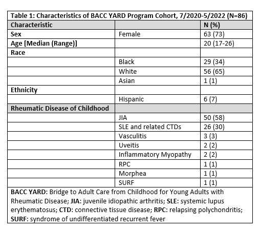 Conclusion: The BACC YARD Program cohort had a significantly reduced median time to first adult visit compared to historical controls. After further study, the BACC YARD intervention could be disseminated to other clinics for young adults with childhood onset rheumatic disease. Table 1