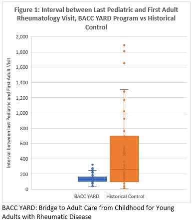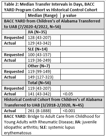 Methods: In 2020 we initiated a specialized transition program structure utilizing a dual adult/pediatric rheumatology clinician with the goal to improve transition outcomes, the Bridge to Adult Care from Childhood for Young Adults with Rheumatic Disease (BACC YARD) Program. Young adults who received the BACC YARD intervention were compiled into an observational registry. In this first phase of the program, an adult/pediatric rheumatologist joined the care team for the final pediatric rheumatology visit, and then saw the patient with an adult rheumatology attending for the first visit in the adult rheumatology clinic. Requested timing for first adult rheumatology visit was determined by joint decision between the adult/pediatric rheumatologist and the pediatric attending at time of pre-transfer visit. The historical control cohort was obtained from the electronic records of Children's of Alabama and University of Alabama at Birmingham (UAB) between March 1, 2018 and March 1, 2020. All historical patients were identified who had at least two pediatric rheumatology visits prior to transfer and were successfully transferred to UAB rheumatology. Data harvest was supplemented by individual chart review to ensure that there was no documentation of visits with a rheumatologist outside of the Children's of Alabama/UAB system in the peri-transfer period.