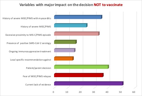 Conclusion: When vaccinating MIS-C patients against SARS-CoV-2, the experience reported by the international pediatric rheumatology community to date is overall reassuring. However, lack of evidence still affects the vaccination strategy of many centres worldwide. Large, prospective studies are needed to properly evaluate the safety of anti-COVID-19 vaccination among MIS-C patients Variables with the greatest impact on the decision not to vaccinate MIS-C patients against SARS-CoV-2 Disclosures: F. Minoia, SOBI; F. Lucioni, None; M. Heshin-Bekenstein, None; S. Vastert, None; C. Kessel, SOBI, Novartis, Novartis; Y. Uziel, None; L. Lamot, None; N. Ruperto, 2 Bridge, Amgen, AstraZeneca, Aurinia, Bayer, Brystol Myers and Squibb, Celgene, inMed, Cambridge Healthcare Research, Domain Therapeutic,, EMD Serono, Glaxo Smith Kline, Idorsia, Janssen, Eli Lilly, Novartis, Pfizer, Sobi, UCB; M. Gattorno, None; C. Bracaglia, SOBI, Novartis; N. Toplak, None.