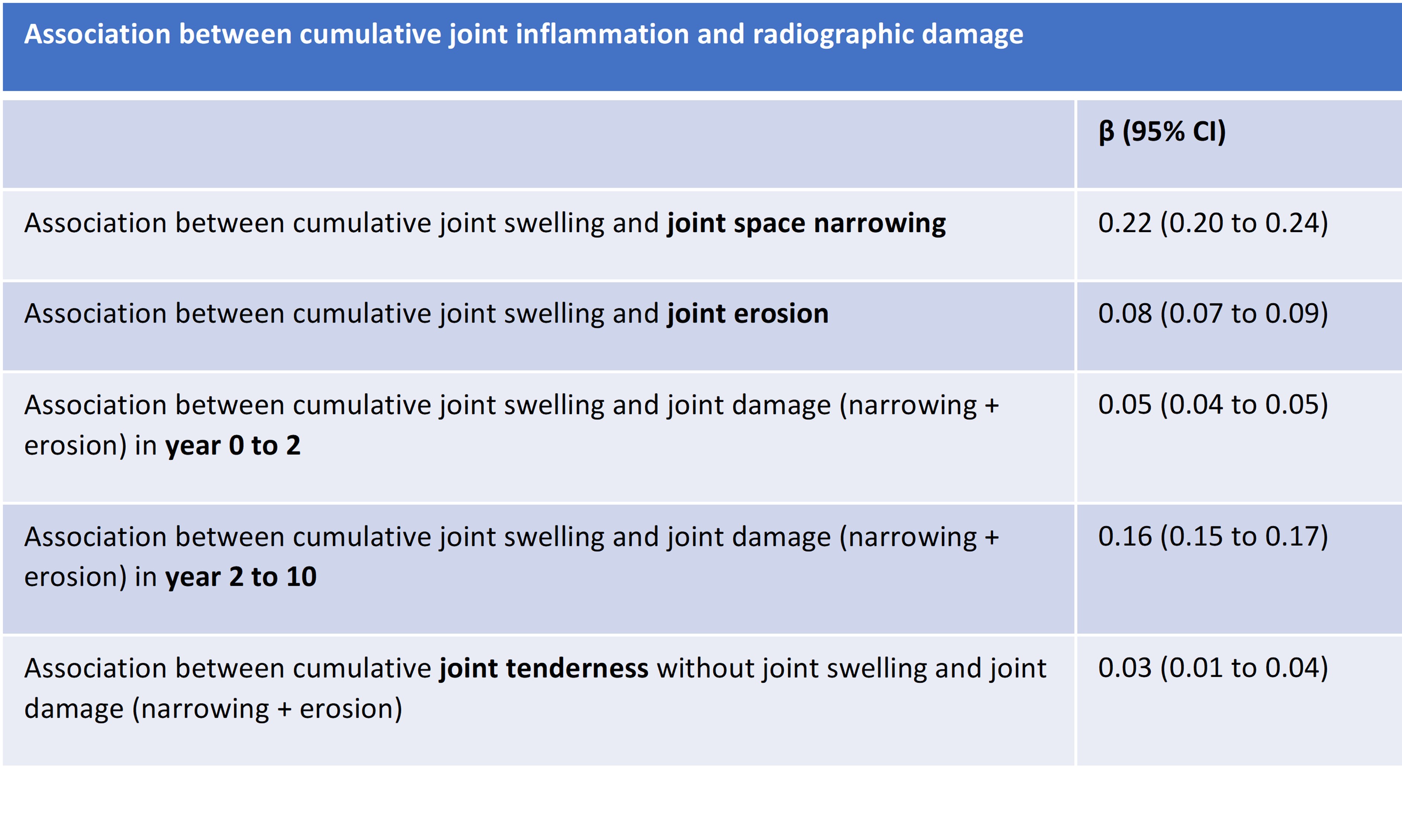 Methods: Data from the BeSt study were used. Patients were treated to target (DAS ≤2.4) for 10 years. Hands and feet were assessed clinically (three-monthly) and radiographically (yearly). Joint space narrowing and erosions were assessed with the Sharp-Van der Heijde score (SHS). Joint space narrowing scores range from 0 to 4 (normal to bony ankylosis or complete luxation) and erosions from 0 to 5 in hand joints (no erosions to complete bone collapse) and 0 to 10 in feet joints (0-5 per bone in one joint). A generalized linear mixed model was used to assess the association between the percentage of study visits at which inflammation was observed in a joint (2 definitions: joint swelling, and joint tenderness without joint swelling) and the degree of radiographic damage in that joint (percentage of the maximal SHS). Joints were nested within patients. The analyses were repeated for erosions and joint space narrowing separately and for two different time periods (baseline to year 2 and year 2 to 10). Analyses were adjusted for baseline (or year 2) damage and follow-up duration. A permutation test was done to verify that the results reflect a local rather than a general disease activity effect.