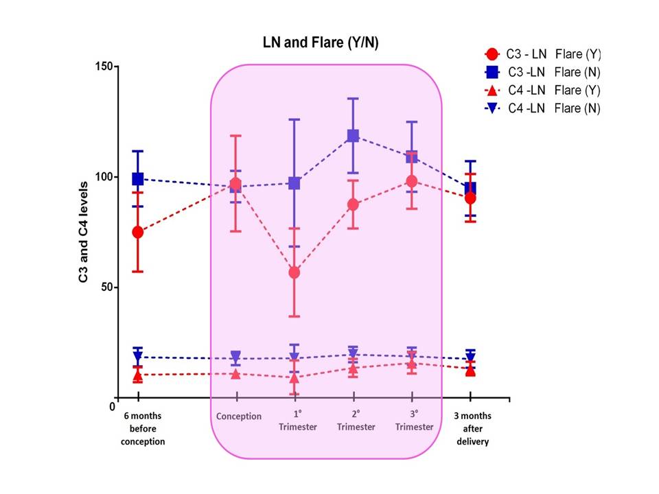 Conclusion: In this prospective large cohort of SLE patients low C3/C4 levels, particularly in T1, were associated with a higher frequency of flare. Lowering levels of complement, especially in T1, even within normal range might alert the treating clinicians in predicting disease course and consequently avoid flares, especially in LN. Figure 1. Complement Levels during time in patients with Lupus Nephritis and presence, or absence, of flare during pregnancy. Disclosures: M. Radin, None; I. Cecchi, None; F. Crisafulli, None; E. Klumb, None; G. De Jesús, None; M. Saavedra, None; G. Reyes-Navarro, None; L. iaccarino, None; M. Larosa, None; G. Moroni, None; F. Tamborini, None; d. Roccatello, None; L. Andreoli, None; C. Chighizola, None; S. Sciascia, None.