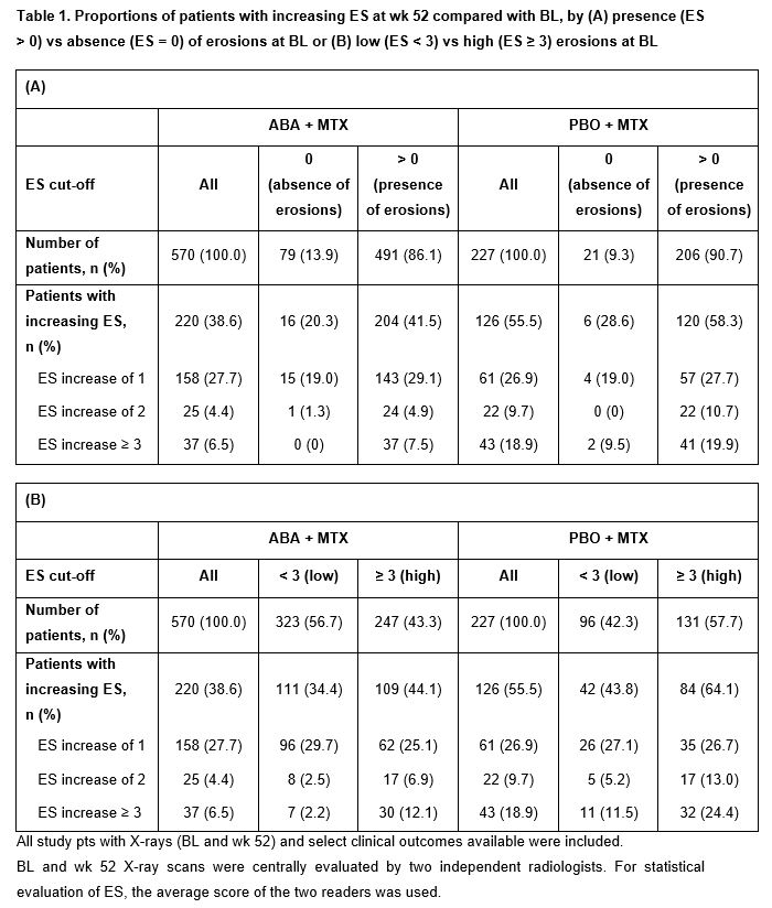 Results: Pts with BL erosions were more likely to have new erosions at wk 52 vs pts without BL erosions in both the ABA + MTX (41.5 vs 20.3%) and PBO + MTX (58.3 vs 28.6%) arms; rates were numerically lower with ABA + MTX vs PBO + MTX (Table 1A). Rates of new erosions were also higher in those with ES ≥ 3 (vs < 3) at BL, and were numerically lower in each subgroup with ABA vs PBO (Table 1B). In the BL erosion present (Table 1A) or high BL erosion groups (Table 1B), the proportions of pts with ES increasing by ≥ 3 in the PBO + MTX arm were at least twice as high as in the ABA + MTX arm. Overall, progression of structural damage was less pronounced in pts in the ABA + MTX vs PBO + MTX arm (ES increase 1–2: 4.4 vs 9.7%, respectively; ES increase ≥ 3: 6.5 vs 18.9%, respectively; Table 1A, 1B).