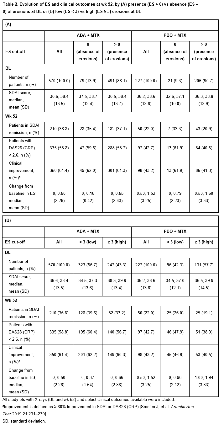 Comparisons were made between pts with BL structural damage presence (ES > 0) vs absence (ES = 0), or high (ES ≥ 3) vs low (ES < 3) structural damage, in either arm and between ABA + MTX vs PBO + MTX arms. Outcome measures at wk 52 included: proportions of pts with ES increase ≥ 1 and by subgroups (increases of 1, 2, ≥ 3); change from BL in ES; and clinical outcomes (Simplified Disease Activity Index [SDAI] remission [≤ 3.3], DAS28 [CRP] < 2.6, and clinical improvement defined as ≥ 80% improvement in SDAI or DAS28 [CRP]).