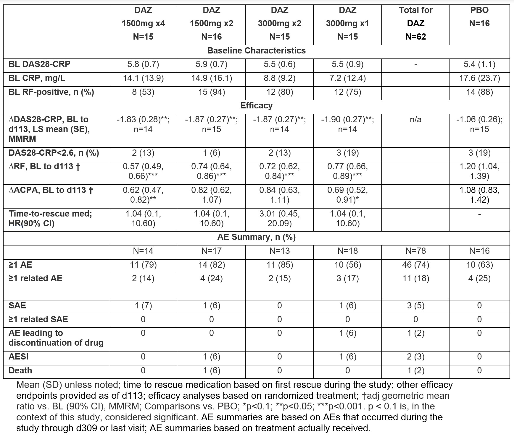 Table: Baseline, Efficacy and Safety Data