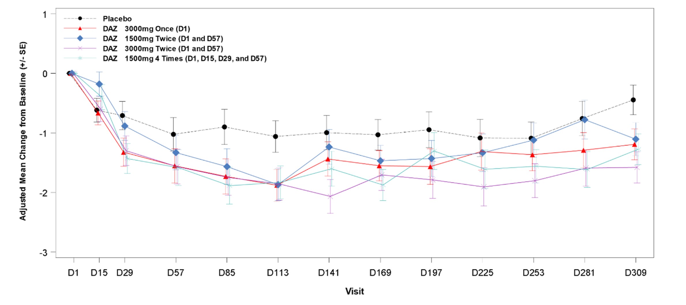 Figure: Adjusted Mean Change from Baseline in DAS28-CRP Score Through End of Study (d309)
