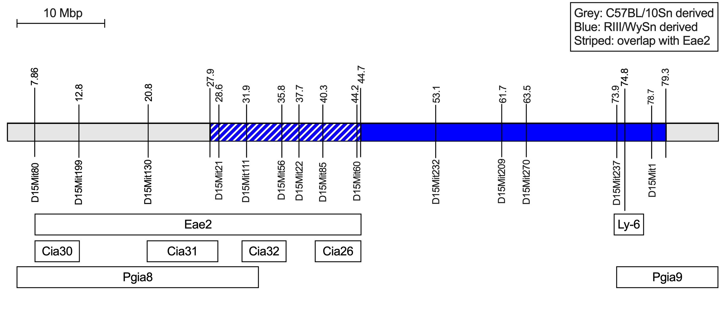 Partial map of chromosome 15 showing the overlap between previously identified arthritis QTLs and the RIII-derived region (blue) in the B10.RIII genome. The position of microsatellite markers used for genotyping is shown in Mbp. Eae = experimental autoimmune encephalomyelitis, Cia = collagen-induced arthritis, Pgia = proteoglycan-induced arthritis