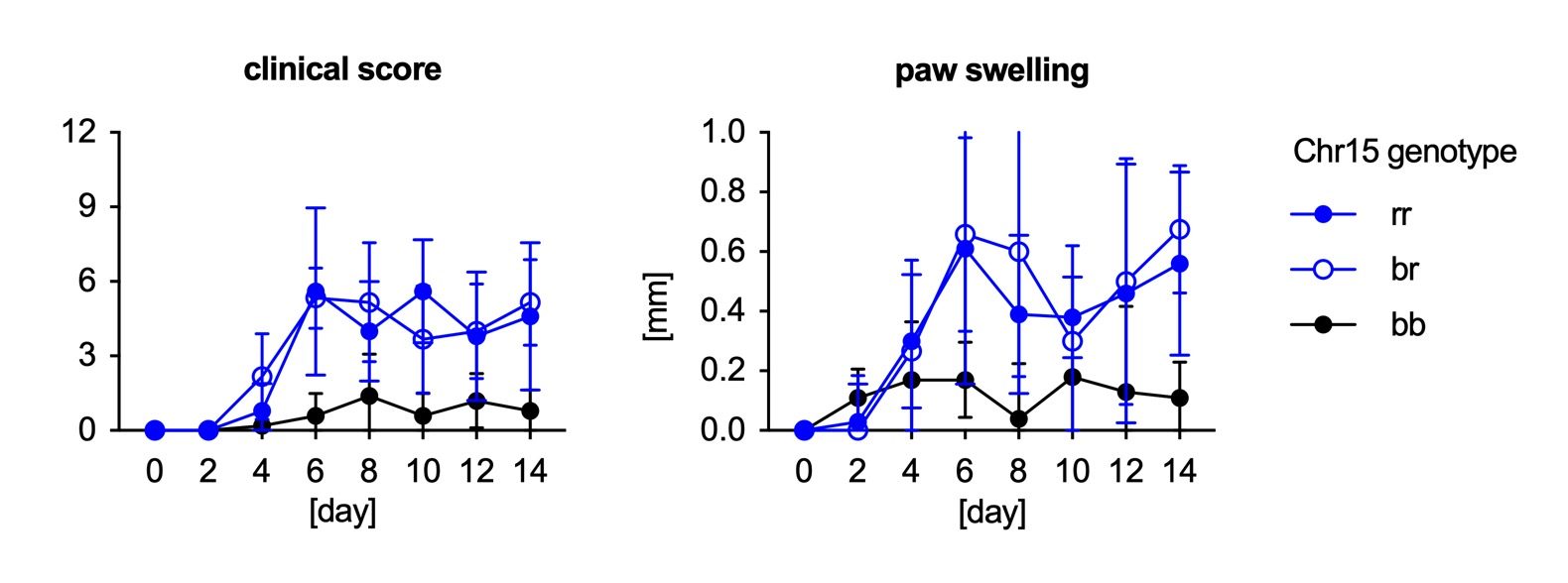 Subcongenic B10.RIII mice heterozygous b/r for the chromosome 15 region (Chr15br) were intercrossed to generate littermates that were Chr15bb, Chr15br or Chr15rr. 8-12-week-old male mice received 50 ng IL-23 EEV via hydrodynamic tail vein injection on day 0. Animals were monitored for clinical score and paw swelling every 2 days until day 14. Data are mean ± SD with 5-7 mice per group.