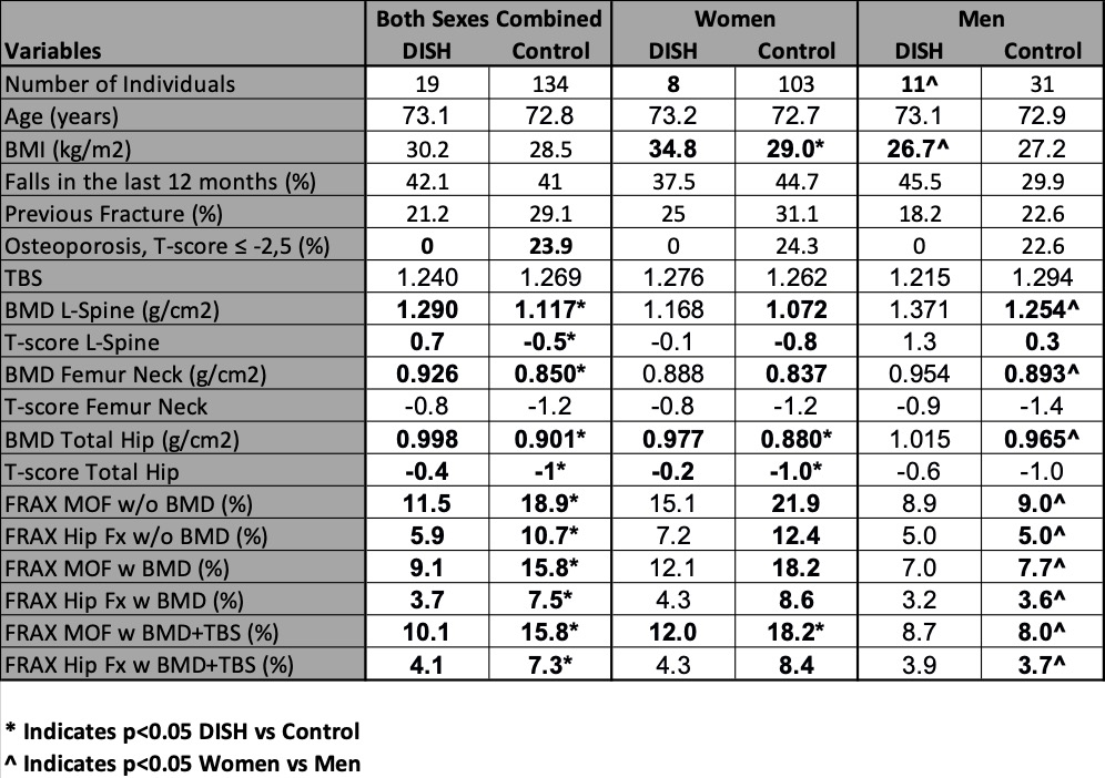 Example of the differences between DXA BMD T-Score (top) and TBS (bottom) in the same patient with DISH