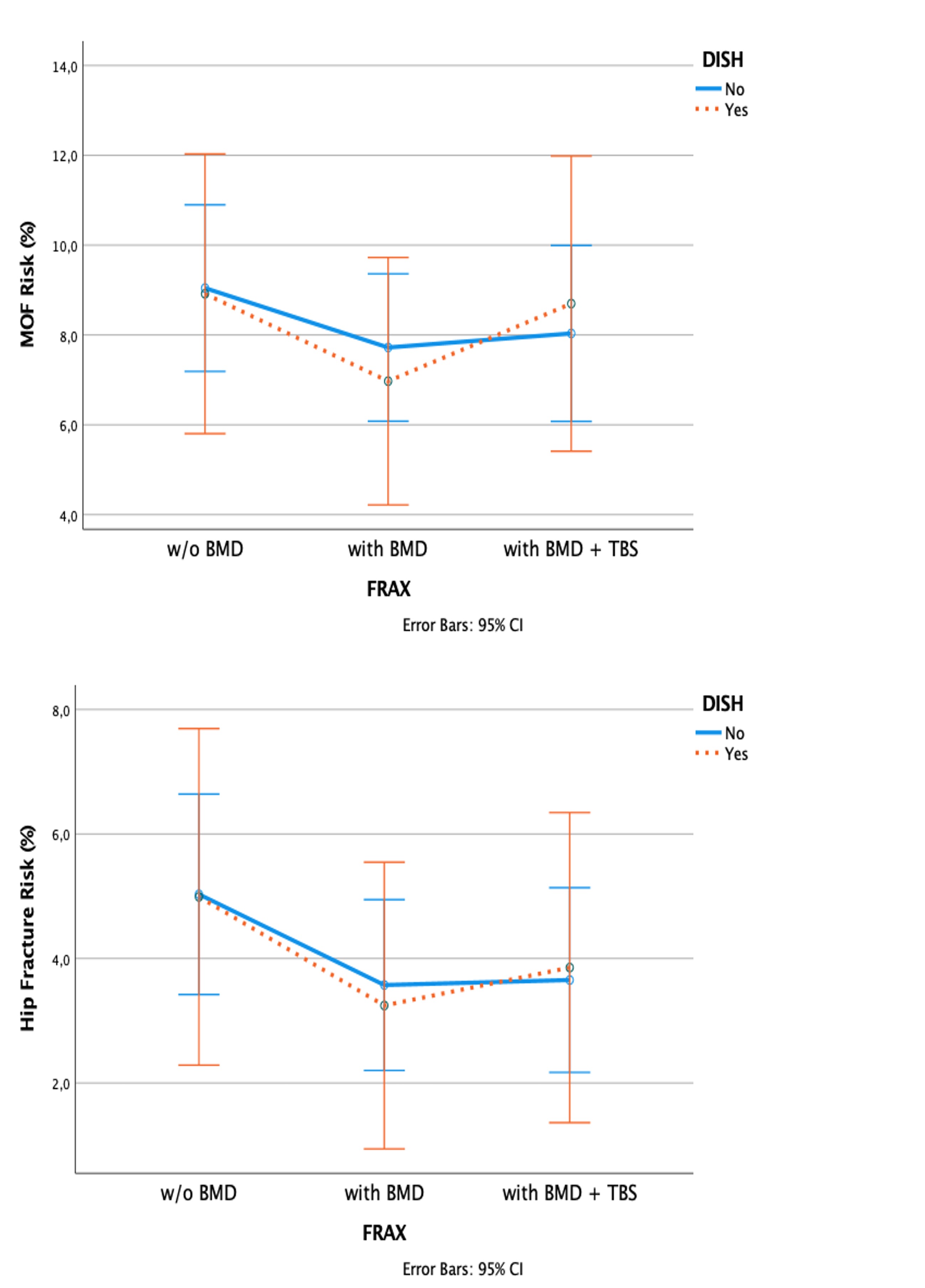 Change in FRAX® fracture risk for MOF (top) and hip fractures (bottom) in men w/wo DISH depending on BMD and TBS inclusion
