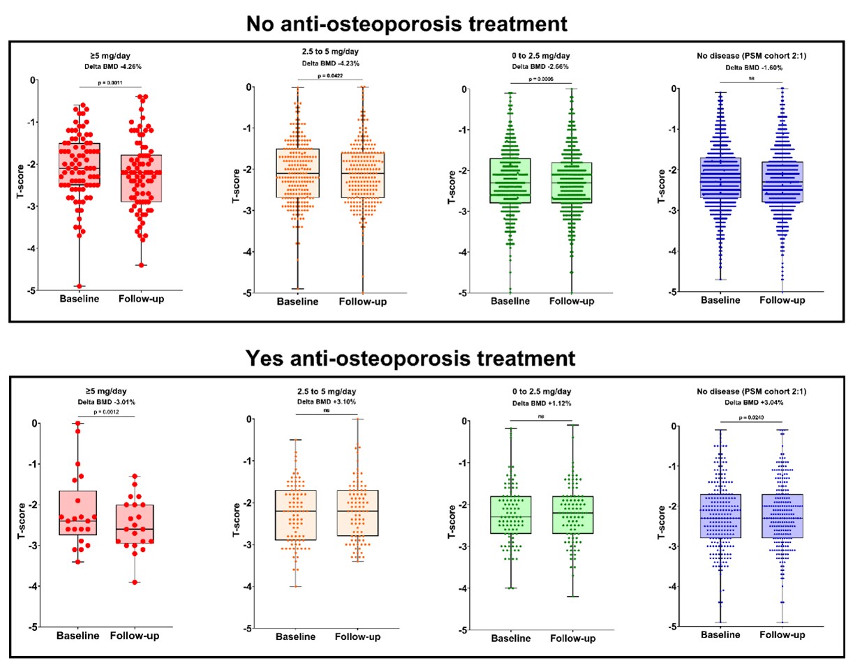 Conclusion: GC doses as low as 2.5 mg/day were associated with BMD loss in iRMD but this effect was preventable with anti-osteoporotic drugs. The latter finding might support anti-osteoporotic treatment initiation in patients taking very low-dose GCs, in direct contrast with most guidelines of GIOP.
