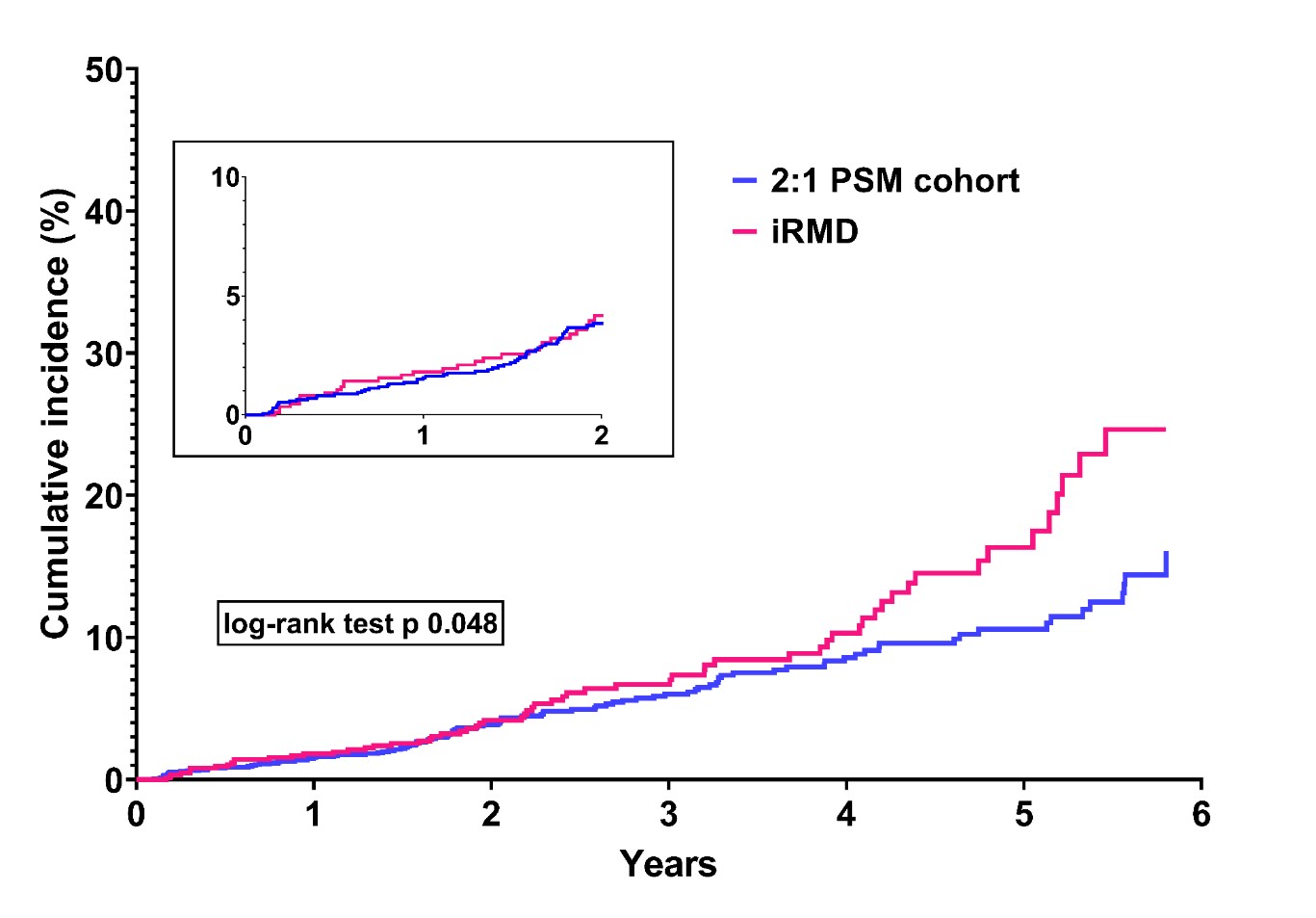 Figure 2. Kaplan-Meier curves for cumulative incidence of fragility fracture in patients with iRMD and controls