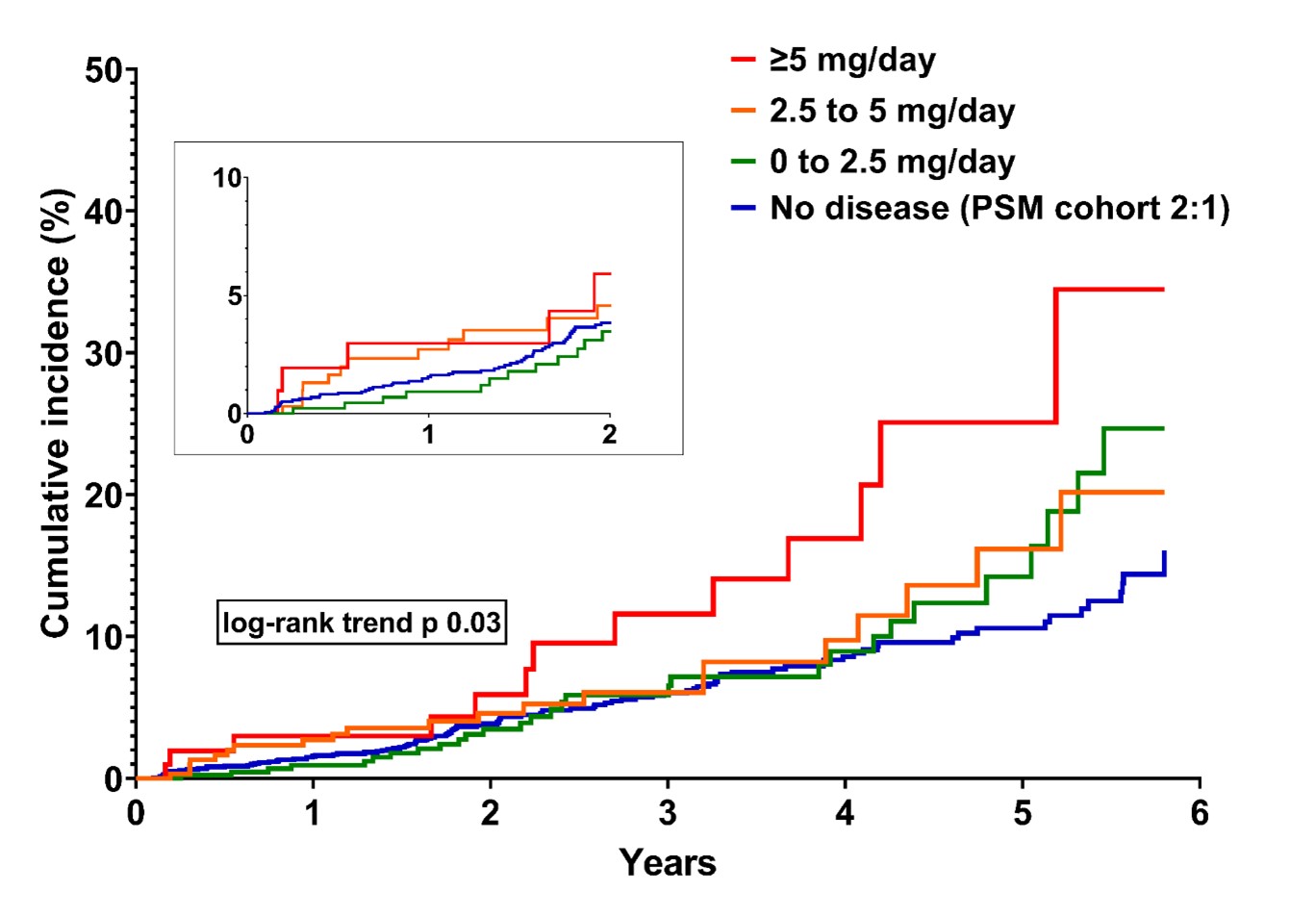 Figure 3. Kaplan-Meier curves for cumulative incidence of fragility fracture in patients with iRMD and controls stratified by glucocorticoid dose