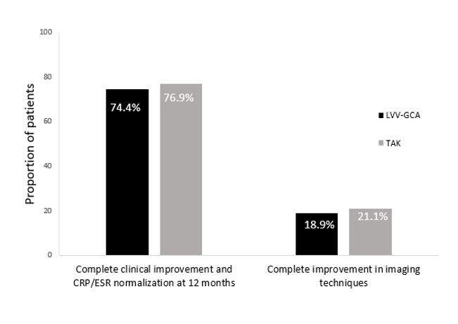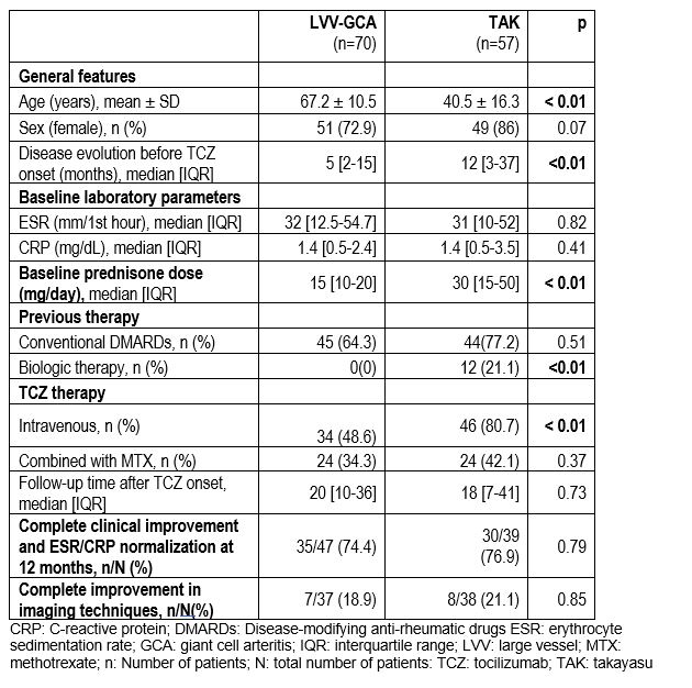 Methods: Observational multicenter study of patients with LVV-GCA and TAK who received TCZ. Outcome variables were: a) proportion of patients who achieved complete clinical improvement along with normalization of laboratory markers (CRP ≤0.5mg/dL and/or ESR ≤ 20 mm/1st hour) at 12 months b) complete improvement in imaging techniques. A comparative study between patients with LVV-GCA and TAK was performed.