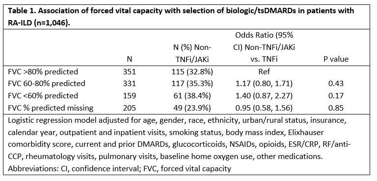 Table 1. Association of forced vital capacity with selection of biologic/tsDMARDs in patients with RA-ILD (n=1,046).