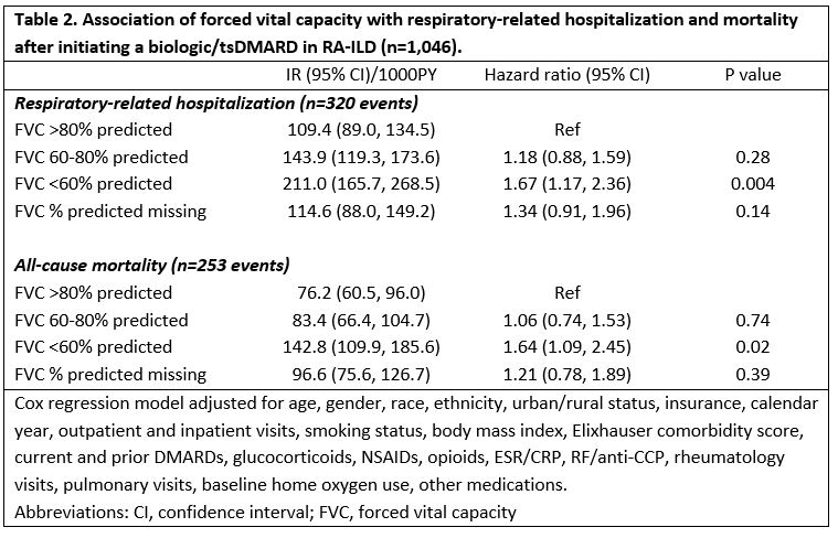 Table 2. Association of forced vital capacity with respiratory-related hospitalization and mortality after initiating a biologic/tsDMARD in RA-ILD (n=1,046).