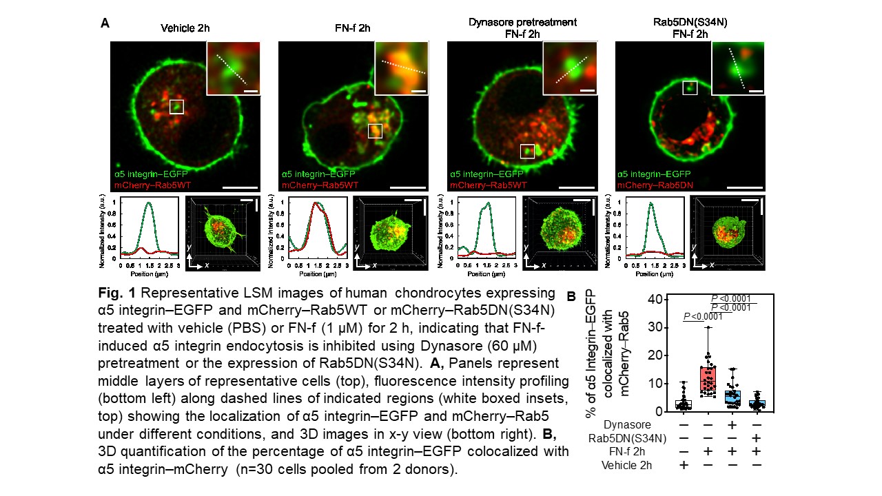 Methods: Primary human chondrocytes were serum starved prior to treatment with a purified 42kD recombinant FN-f (FN7-10) containing the α5β1 integrin binding region or intact FN for comparison. Plasmid constructs expressing fluorescent tagged proteins were used to locate the α5 integrin subunit, FN7-10, Nox2, early and late endosomes, and Src by confocal microscopy. Compartmentalized redox biosensors (HyPer3-tk, HyPer-cyto, and Hyper-Rab5) were used to track H2O2 production using time-lapse live cell imaging. The dynamin inhibitor Dynasore (60 µM) and transfection with dominant negative Rab5 (Rab5DN(S43N)) were used to inhibit endocytosis.