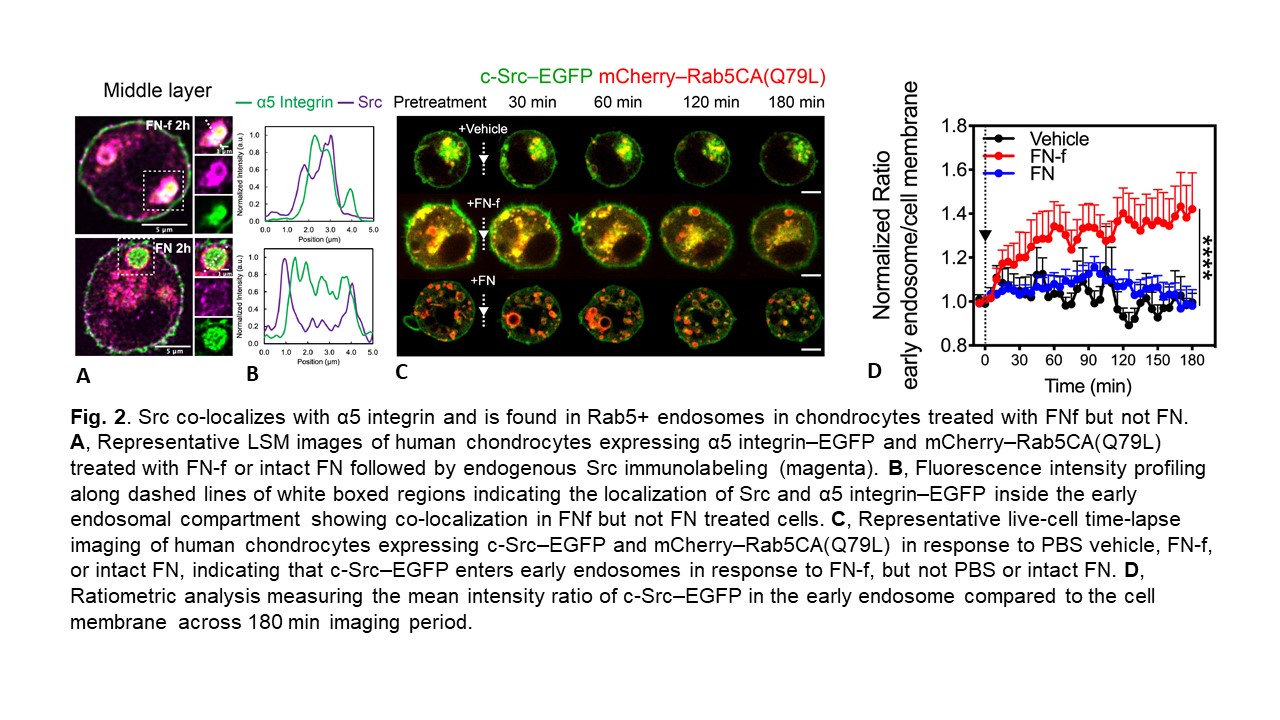Results: FN-f and intact FN both induced α5-EGFP to enter early (Rab5+) endosomes but co-localization with Nox2 only occurred with FN-f. FN-f-EGFP also demonstrated co-localization with Rab5 indicating FN-f and α5 were endocytosed into early endosomes. Endocytosis of FN-f and α5 integrin was significantly reduced by Dynasore or by expression of dominant negative Rab5 (Fig.1) and this inhibited FN-f activation of MAPK signaling and MMP-13 production. The H2O2 biosensors indicated that FN-f induced H2O2 at the plasma membrane and then localization in the cytosol and early endosomes. EGFP-Nox2 gradually entered α5 integrin+/Rab5+ vesicles at the time point when endosomal H2O2 was detected, consistent with the formation of "redoxosomes". Inhibition of H2O2 or Nox2 blocked FN-f induced MMP-13 production. The redox regulated tyrosine kinase Src co-localized with α5 integrin in early endosomes in response to FN-f but not intact FN (Fig. 2). Co-localization of Src and Nox2 were significantly increased in endosomes from chondrocytes treated with FN-f and in OA cartilage sections. Different from FN-f induced integrin endocytosis, in which a degradative pathway was followed through Rab7+ vesicles, α5 endocytosis with intact FN followed a recycling pathway through Rab11+ vesicles which would return the integrin to the cell surface.