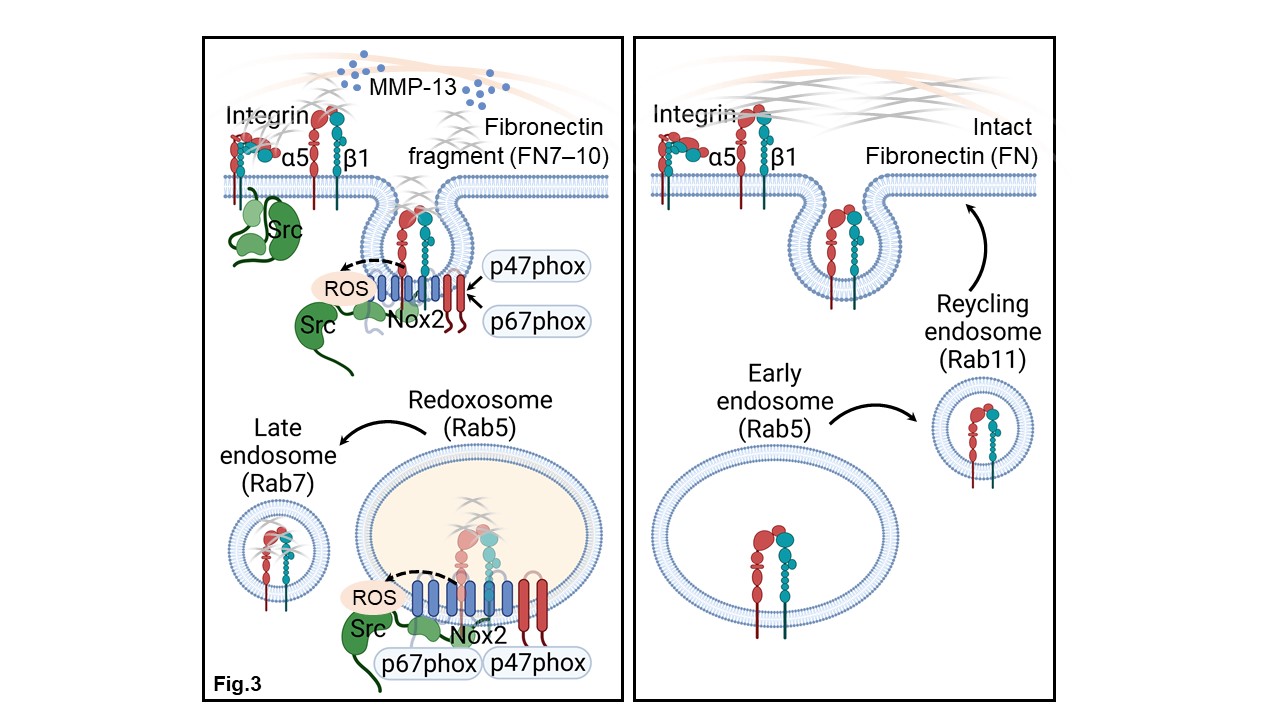 Conclusion: Chondrocytes endocytosed the FN7-10 matrikine along with the α5β1 integrin to generate signaling redoxosomes for the generation of H2O2 by Nox2 in a temporospatial pattern (Fig.3). In contrast, binding of intact FN did not activate redox signaling and resulted in recycling of the α5β1 integrin to the chondrocyte cell surface. These findings reveal an intricate redox regulated mechanism by which chondrocytes respond to a FN matrikine and provide novel targets to control the progressive cartilage degradation seen in OA.
