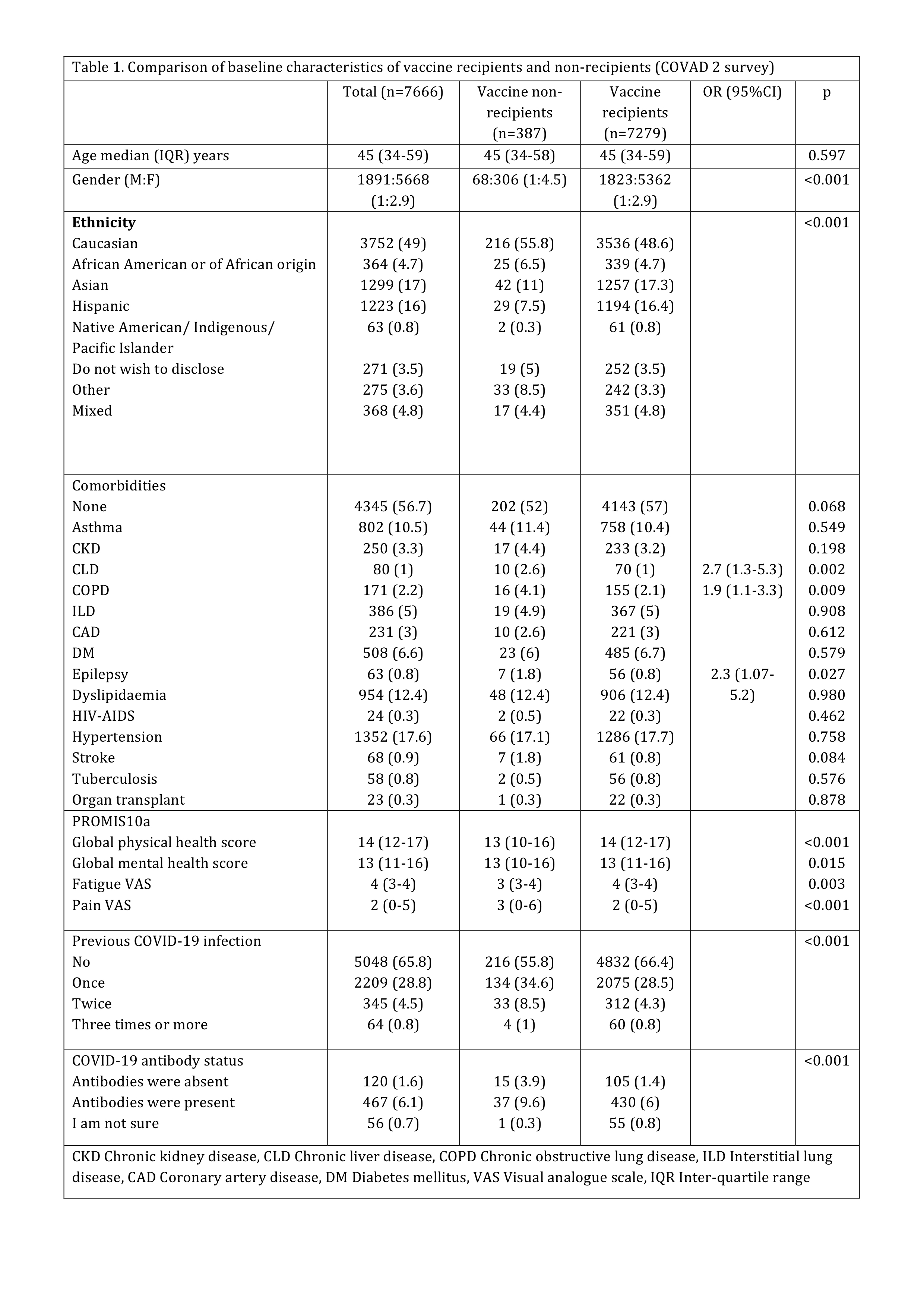 Table 1. Comparison of baseline characteristics of vaccine recipients and non-recipients (COVAD 2 survey)