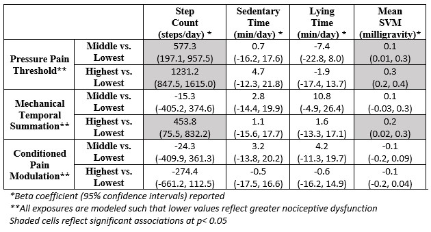 Methods: We used data from the Multicenter Osteoarthritis Study (MOST), a longitudinal cohort study of individuals with and without knee OA. Measures of nociceptive functioning served as exposures and included pressure pain threshold (PPT) at the knee, mechanical temporal summation (TS) at the wrist, and conditioned pain modulation (CPM) using the forearm ischemia test. Lower PPT is reflective of increased peripheral or central pain sensitivity. Greater mechanical TS is reflective of increased central pain sensitivity. Lower CPM reflects inefficient descending pain modulation. Physical activity was assessed over 7-days using a lower back worn activity monitor. Summary metrics included steps/day, sedentary time, lying time, and mean 3D signal vector magnitude (SVM, reflects activity intensity). We evaluated the relation of pain sensitivity measures per standard deviation unit as tertiles (lower tertile as reference) to the physical activity measures using linear regression while adjusting for age, sex, race, body mass index (BMI), education, and presence of radiographic knee OA. The exposures were modeled such that lower values reflect greater nociceptive dysfunction. We did not adjust for pain because we hypothesized that pain was on the causal pathway between our exposure and outcomes.