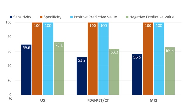 Figure 1: Diagnostic value in terms of sensitivity, specificity, positive predictive value and negative predictive value for three imaging modalities in patients with suspected giant cell arteritis. US=ultrasound, FDG-PET/CT=[18F]fluorodeoxyglucose-positron emission tomography/computed tomography, MRI=magnetic resonance imaging.