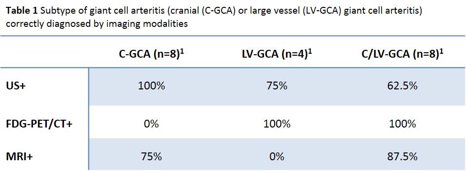 (1) Based on all imaging results in patients with a positive reference diagnosis. +=positive for giant cell arteritis. Nf3 had negative results on all imaging modalities and could therefore not be classified in subtypes.