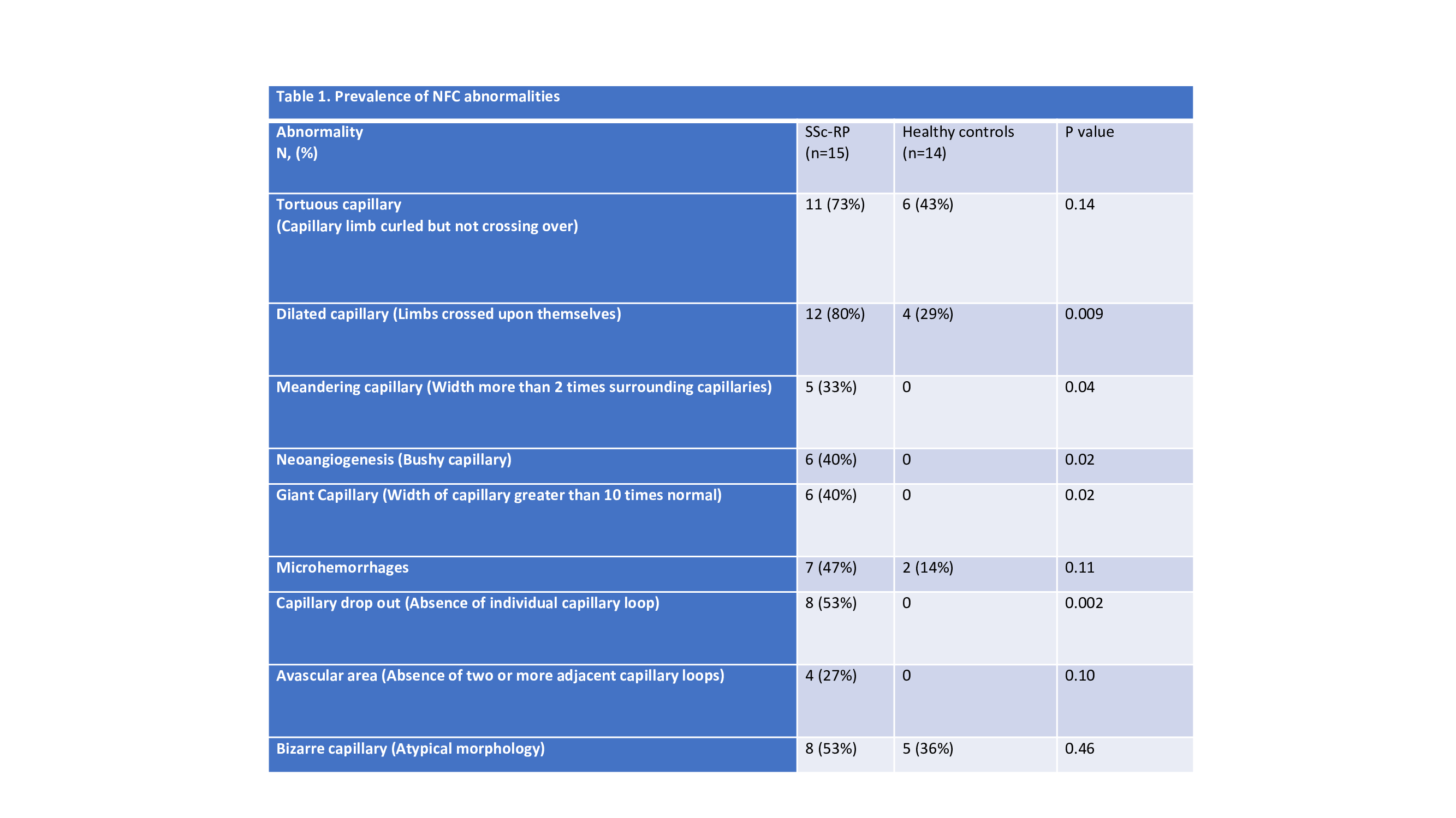 Results: Patients with RP and HC, respectively, were predominantly white (n=10, 67% vs. n=10, 71%) women (n=13, 87% vs. n=13, 93%) with a median (IQR) age of [59 (49-64) vs. 48 (39-57)]. Scleroderma NFC pattern was more prevalent in SSc compared to HC (87% vs. 0%, p< 0.001). Mean semi-quantitative score in SSc was 1.88 compared to 0 in HC (p< 0.001). Mean capillary density measured per linear mm was lower in SSc compared to HC (5.5 vs. 9.3, p< 0.001). Prevalence of various specific NFC abnormalities tended to be higher in SSc compared to HC (Table 1) with significantly more dilated capillaries, meandering capillaries, neoangiogenesis, giant capillaries, and capillary drop-out in SSc. Among SSc patients, mean (SD) ASRAP score was 53.2±11.9 and correlated significantly with mean semi-quantitative score (rho 0.59, p=0.02).