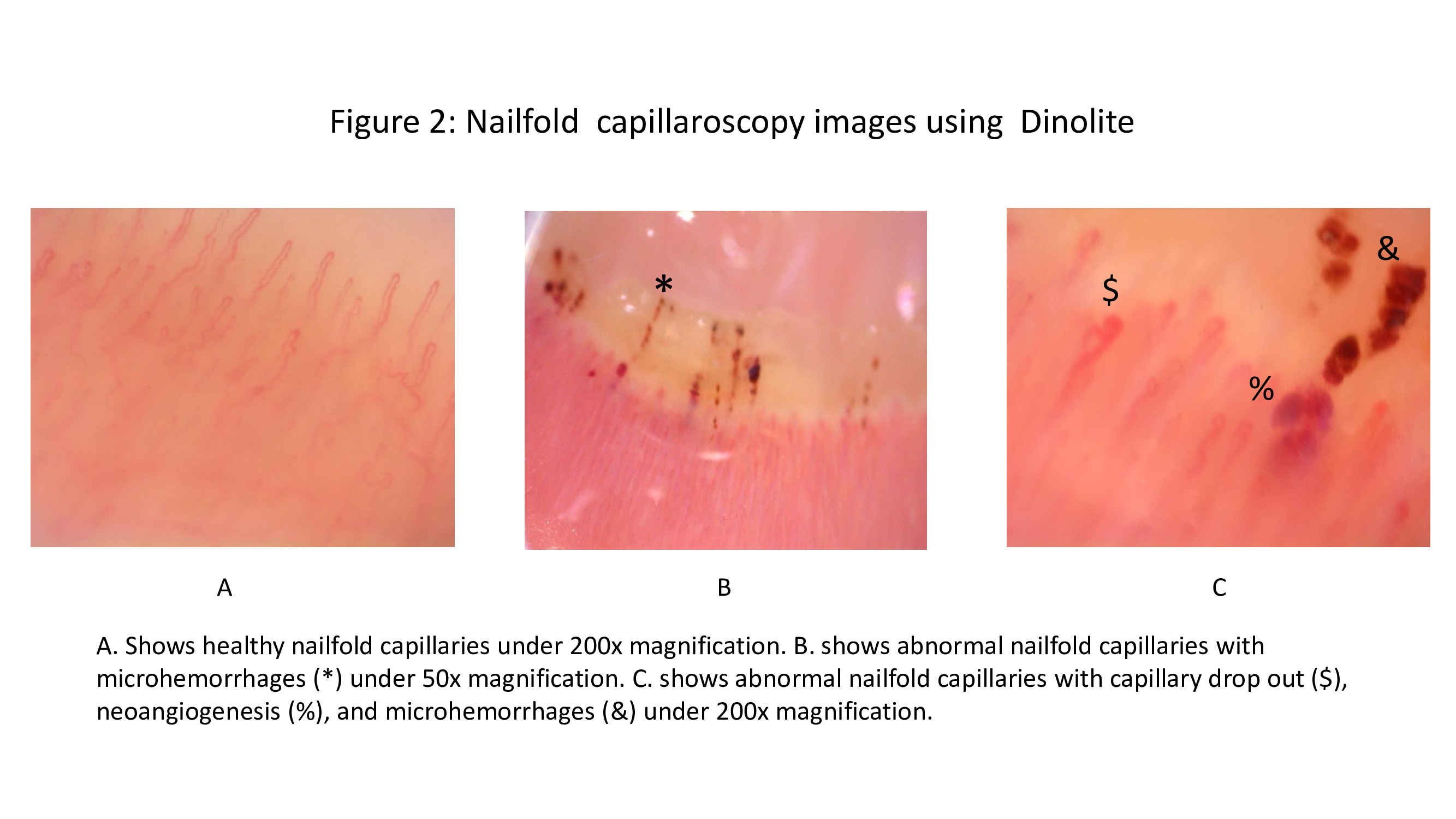 Background/Purpose: The clinical importance of nailfold capillaroscopy (NFC) has grown since its inclusion in the 2013 ACR/EULAR Classification Criteria for systemic sclerosis (SSc), yet few centers have expensive video NFC systems, and dermatoscope evaluations have limited sensitivity for abnormality detection. Dinolite™ (AF4515-N2UT) offers a handheld, inexpensive, and convenient method for in-clinic NFC images at 200x magnification (Fig. 1). We piloted the clinical utility of Dinolite NFC in patients with SSc.