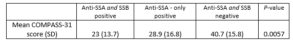 COMPASS-31 scores in SjD patients according to Anti-SSA and Anti-SSB status. Data are presented as mean (standard deviation).