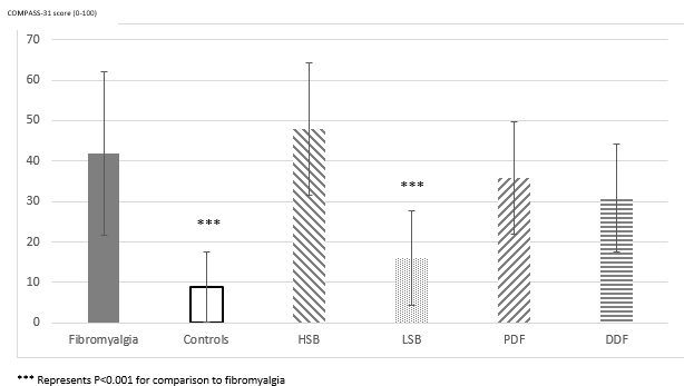 Total COMPASS-31 scores in FMS, healthy controls, and SjD Subgroups.