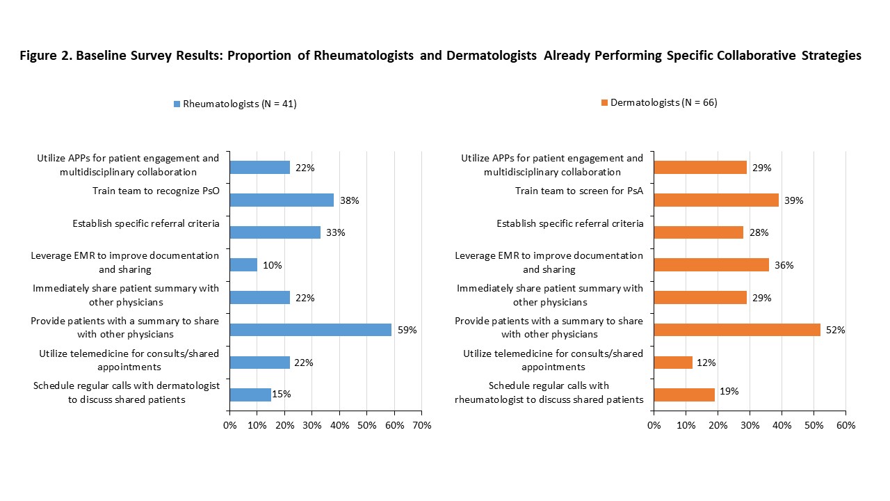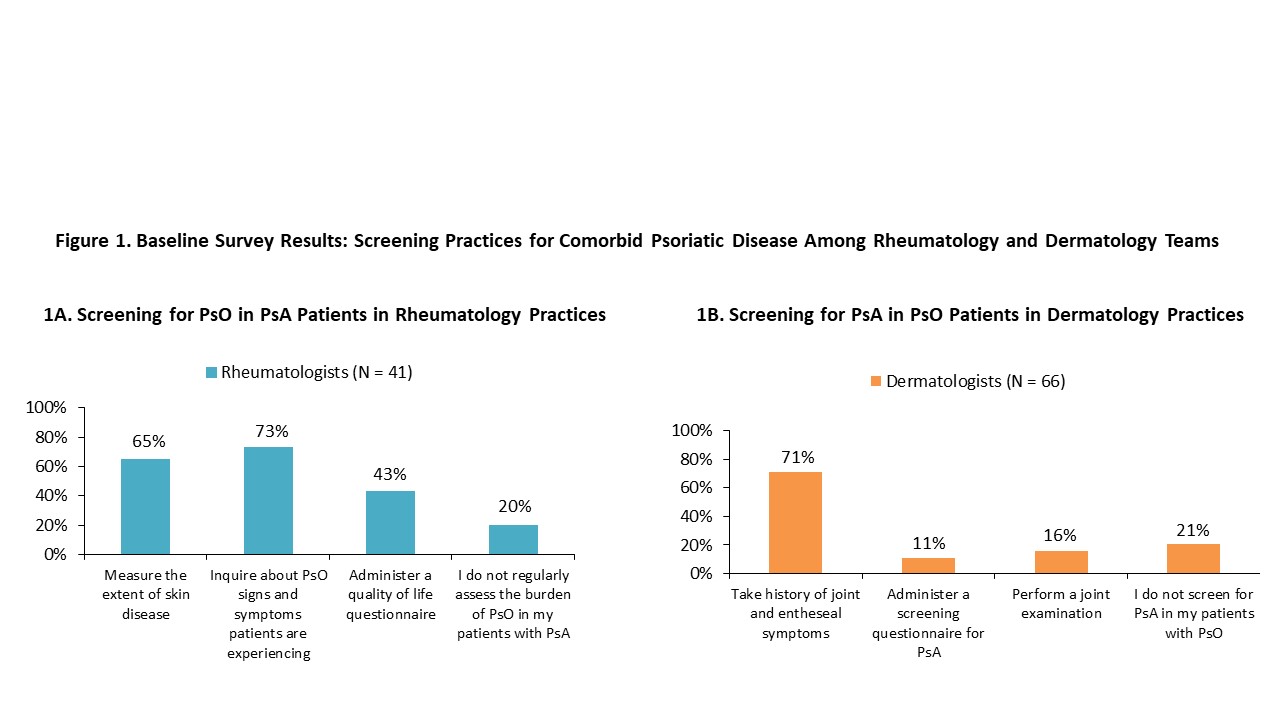 Methods: Surveys on clinical practice trends and challenges were administered to 14 clinical teams (7 rheumatology and 7 dermatology practices, which were regionally paired). The paired rheumatology and dermatology teams then engaged in an interactive educational session, led by expert faculty, to review their survey data and set action plans.