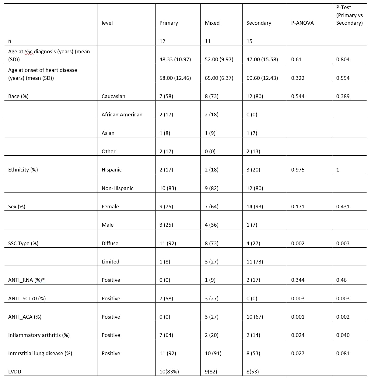 Results: There were 12 patients with primary SHI, 11 patients with mixed & 15 with secondary causes of their heart disease. Those with primary SHI were significantly associated with presence of diffuse cutaneous scleroderma (p=0.03), inflammatory arthritis (p=0.04), and the ScL70 antibodies (p = 0.03). Subjects with ACA antibodies were significantly protected from developing primary SHI (p = 0.002). Nearly all of those with primary SHI had ILD, compared to about half of those with secondary SHI (92% vs. 53%, p=0.081). 83% of patients with primary SHI had LVDD, 82% of patients with mixed heart disease had LVDD compared to 53% of patients with secondary heart disease had LVDD. This was not statistically significant.