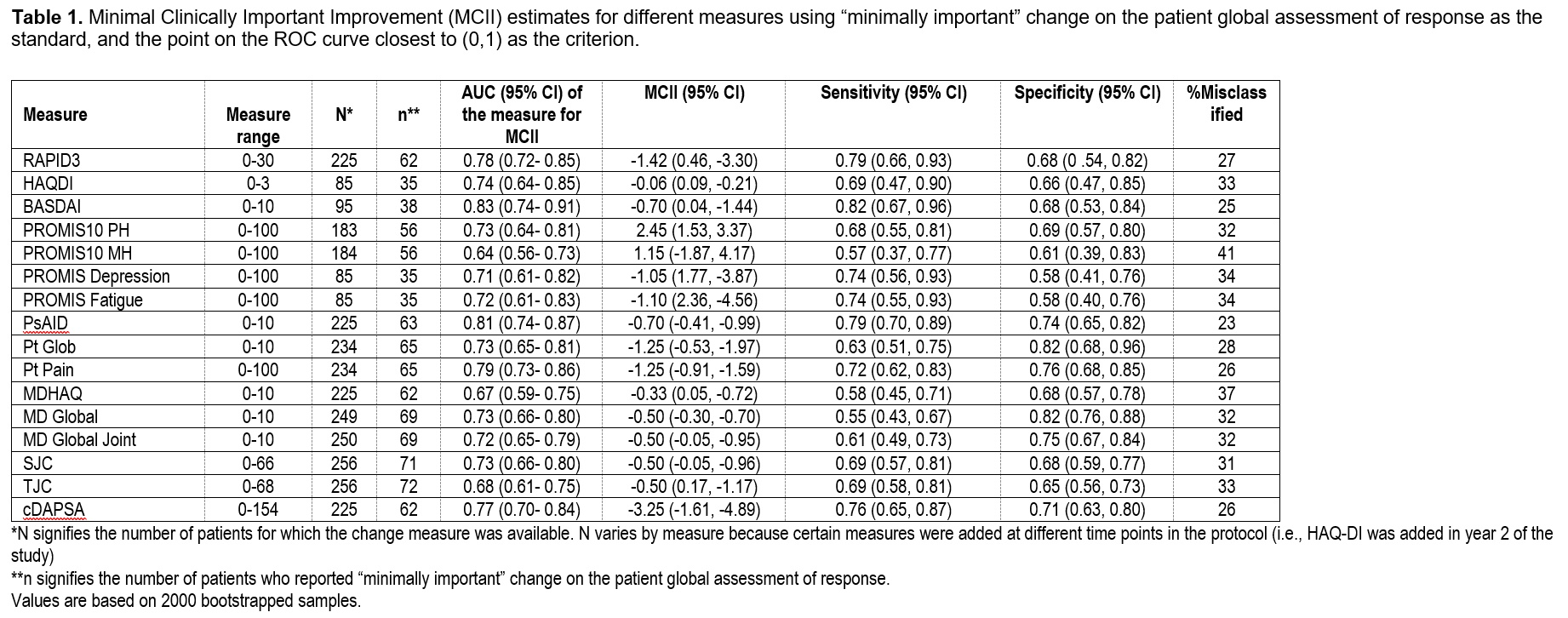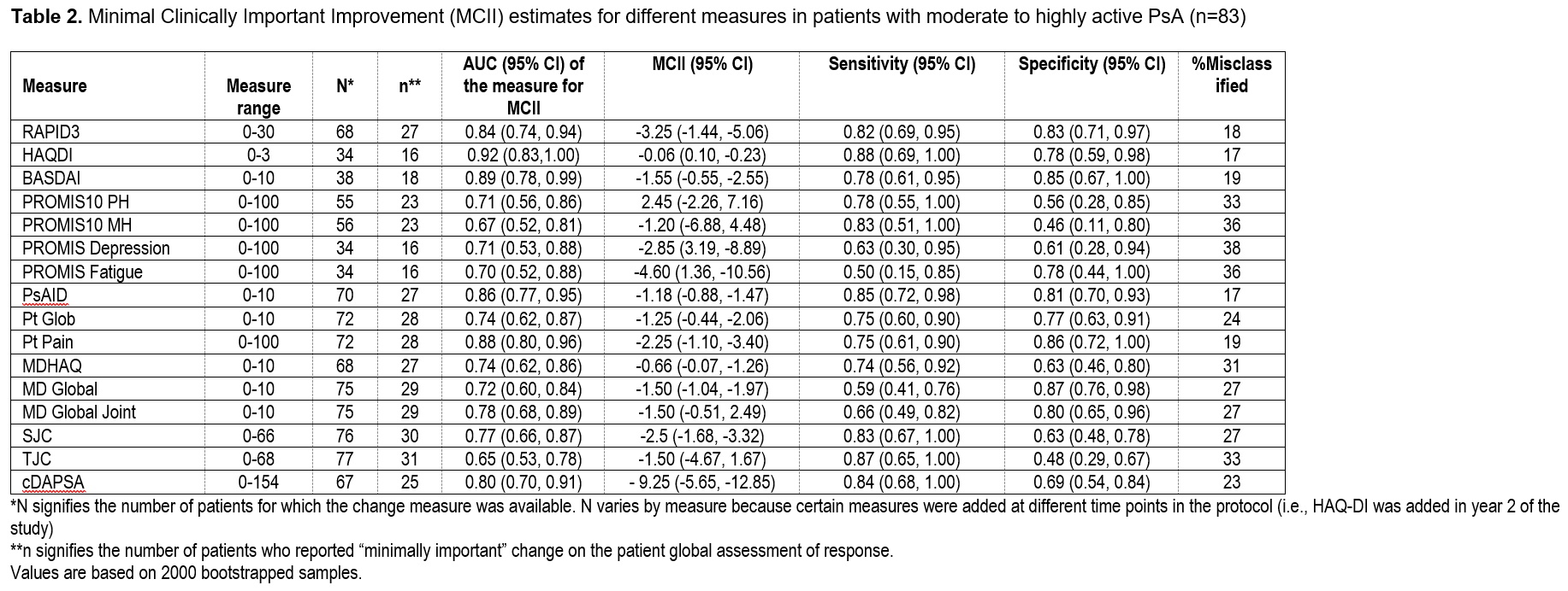 Table 2. Minimal Clinically Important Improvement (MCII) estimates for different measures in patients with moderate to highly active PsA (n=83)