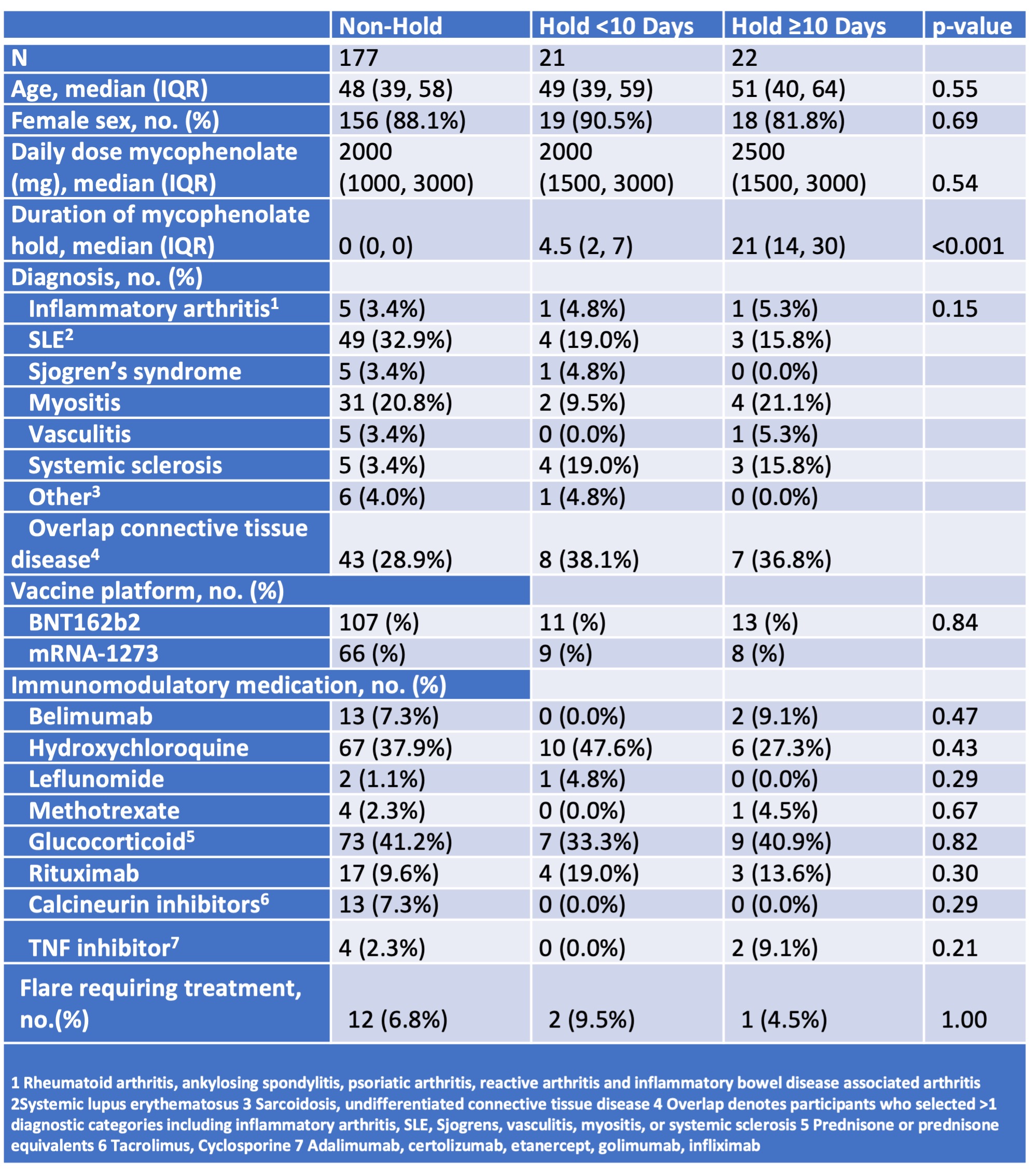 Table 1. Demographic and clinical characteristics, stratified by peri-vaccination mycophenolate hold duration.