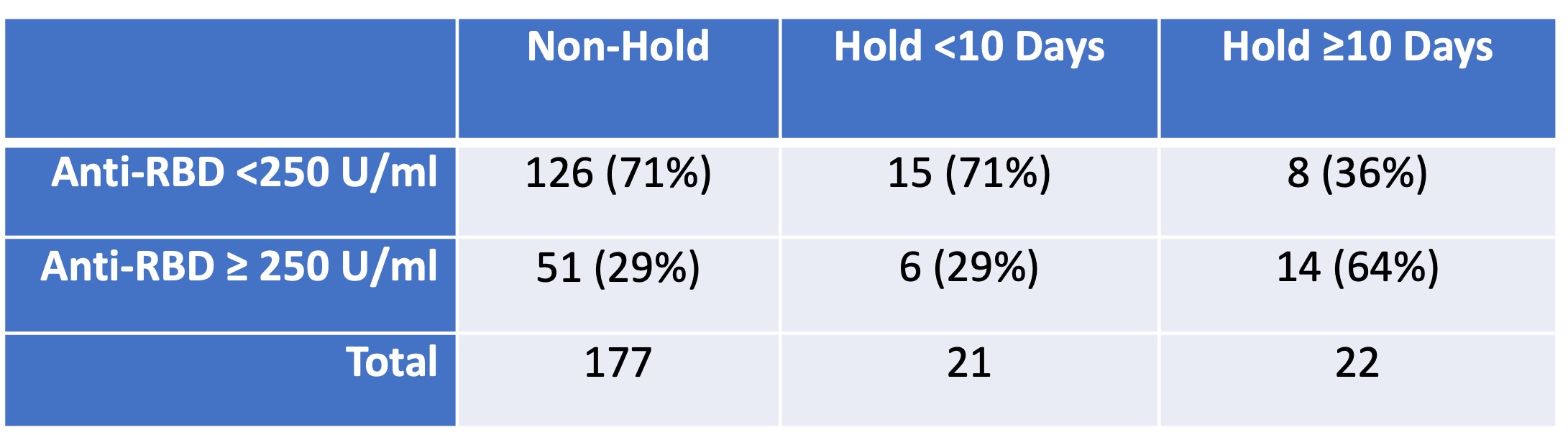 Table 2. Anti-spike antibody response following two dose SARS-CoV-2 vaccine dose in RMD, stratified by peri-vaccination mycophenolate hold duration.